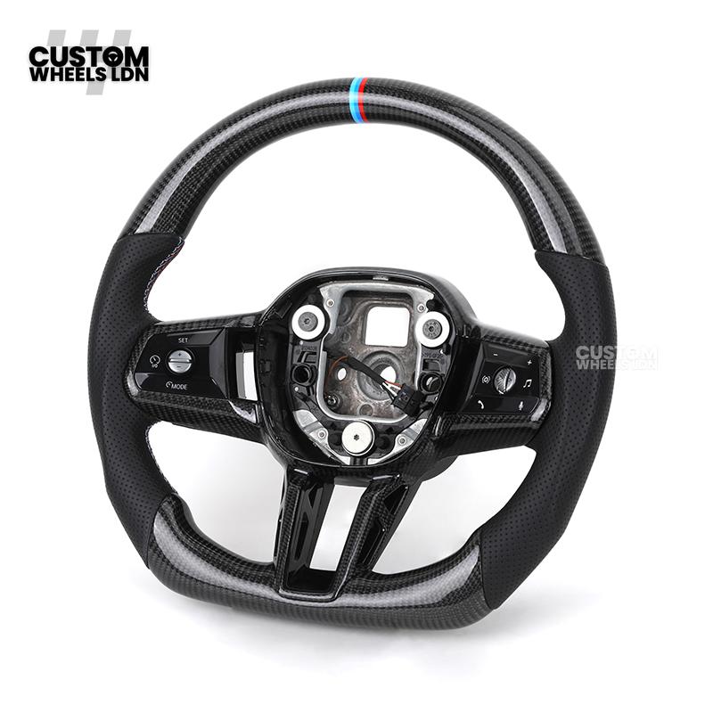 BMW Custom i5 G60 Flat Bottom Steering Wheel – Carbon Fiber, BMW M Stripe, Black Trim, Perforated Leather Grips | Fits G20 3 Series, G22 4 Series, G30 5 Series + more | Plug & Play | Retrofit Upgrade for Older Models