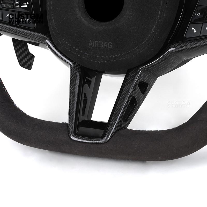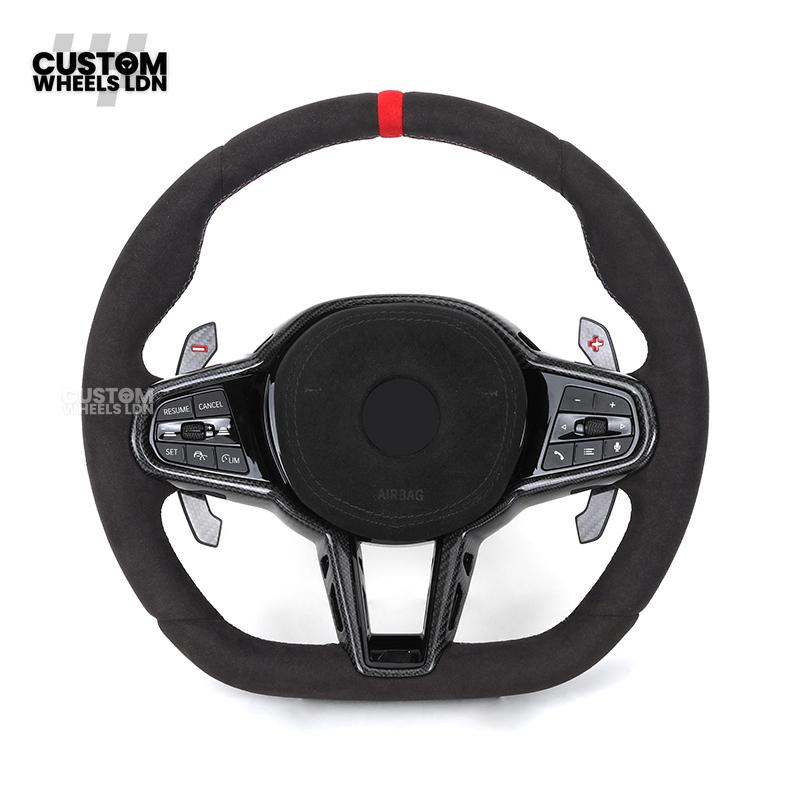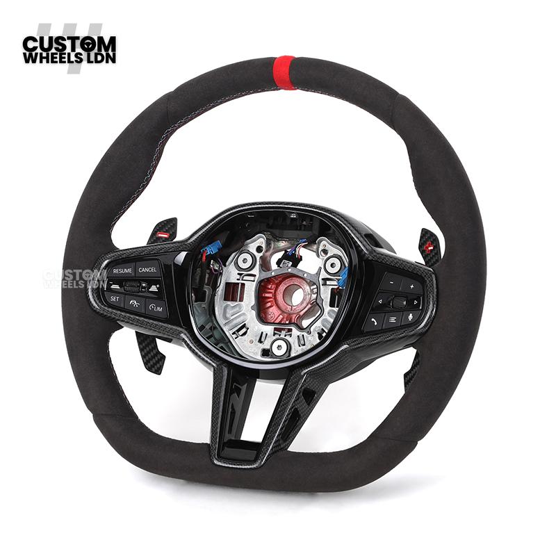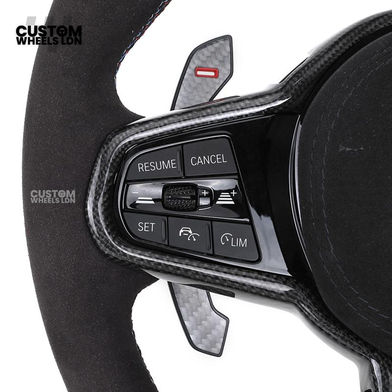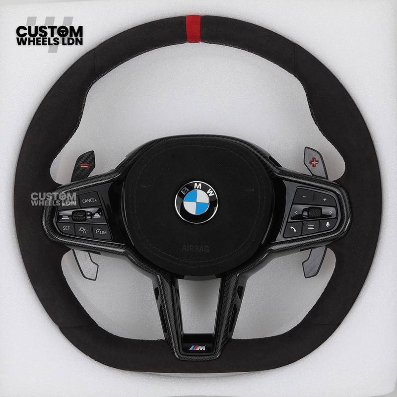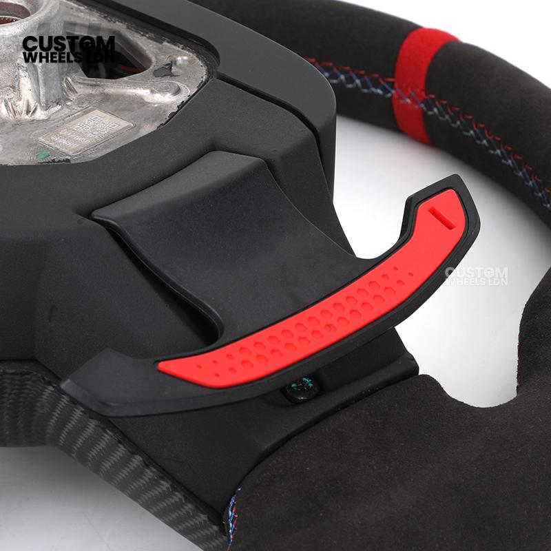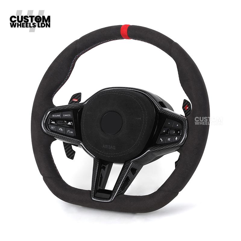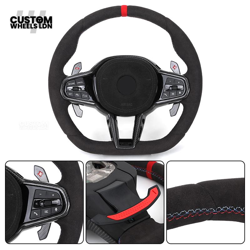 BMW Custom LCI-Style Flat Bottom Steering Wheel – Alcantara, Carbon Fibre Trims, M-Coloured Stitching, Red M Buttons, Carbon Paddles | Fits G80 M3, G82 M4, G20 3 Series, G22 4 Series, G30 5 Series + more | Plug & Play | Retrofit Upgrade for Older Models