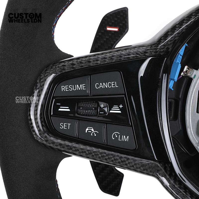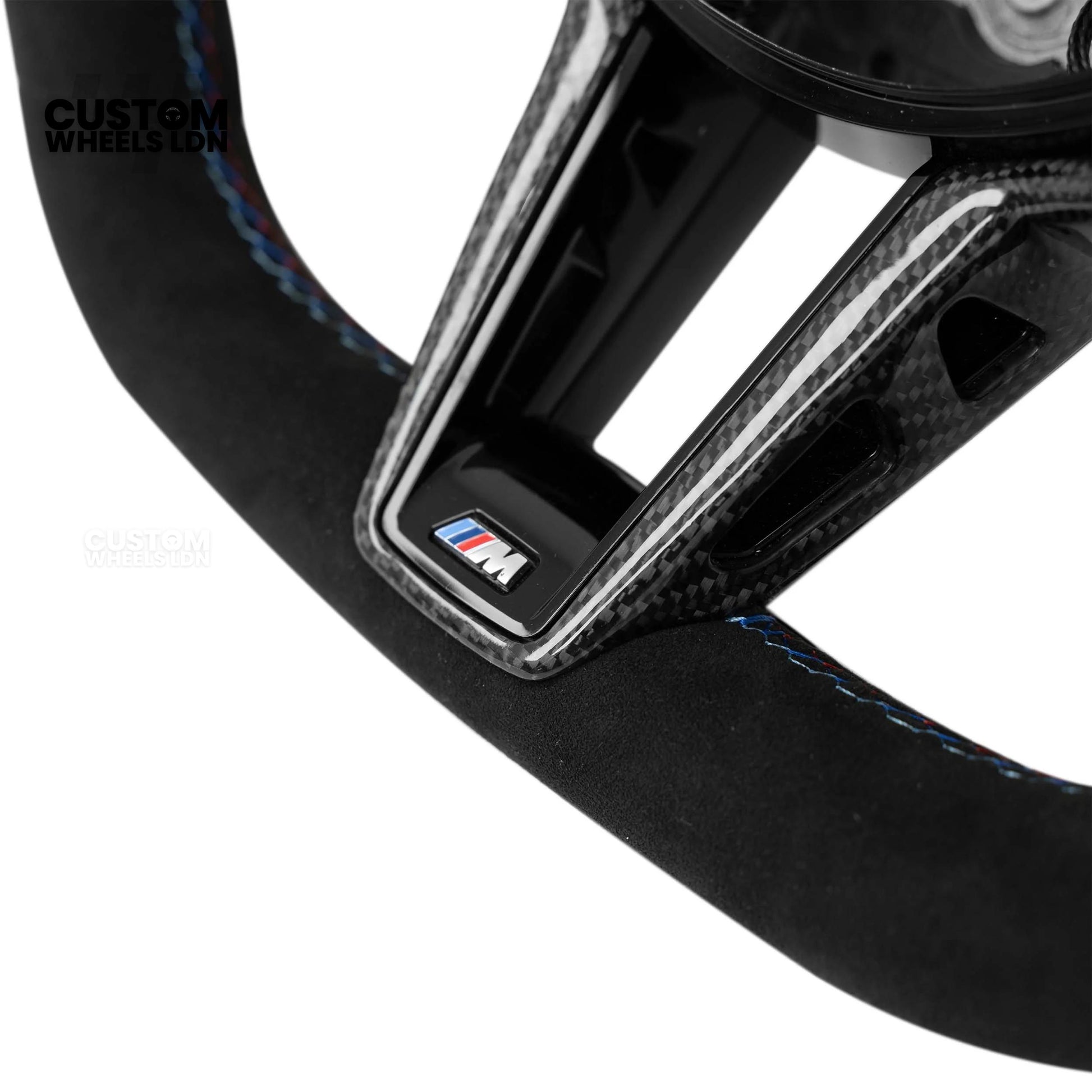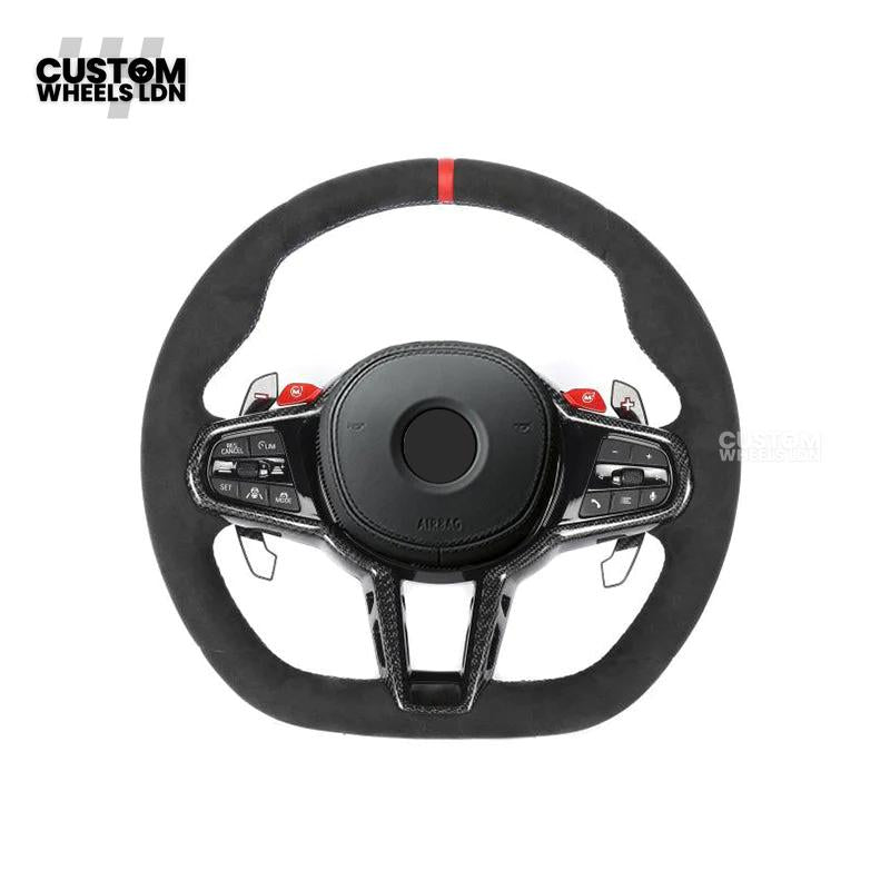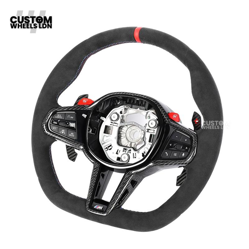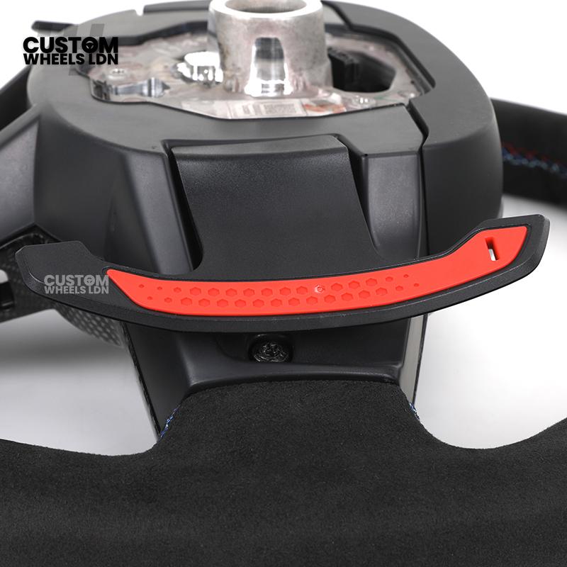 BMW Custom LCI-Style Flat Bottom Steering Wheel – Alcantara, Carbon Fibre Trims, M-Coloured Stitching, Red M Buttons, Carbon Paddles | Fits G80 M3, G82 M4, G20 3 Series, G22 4 Series, G30 5 Series + more | Plug & Play | Retrofit Upgrade for Older Models
