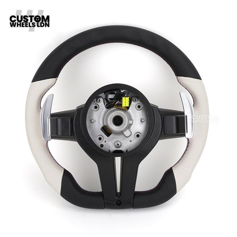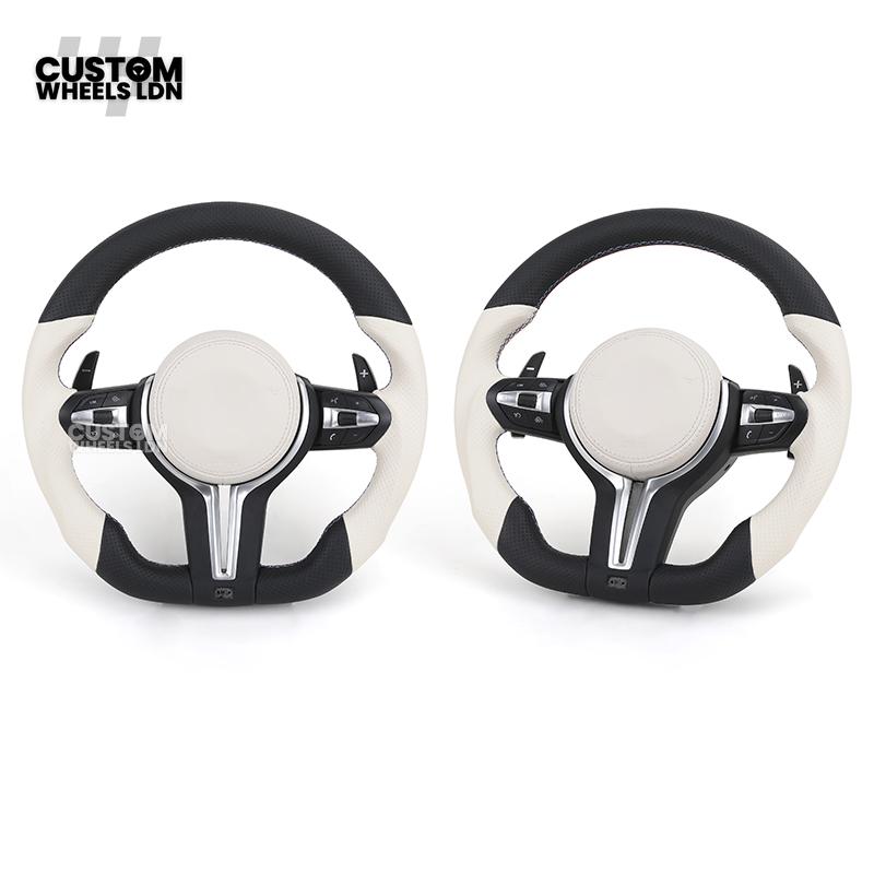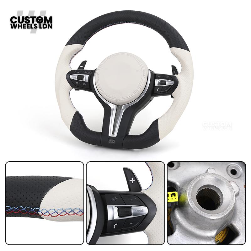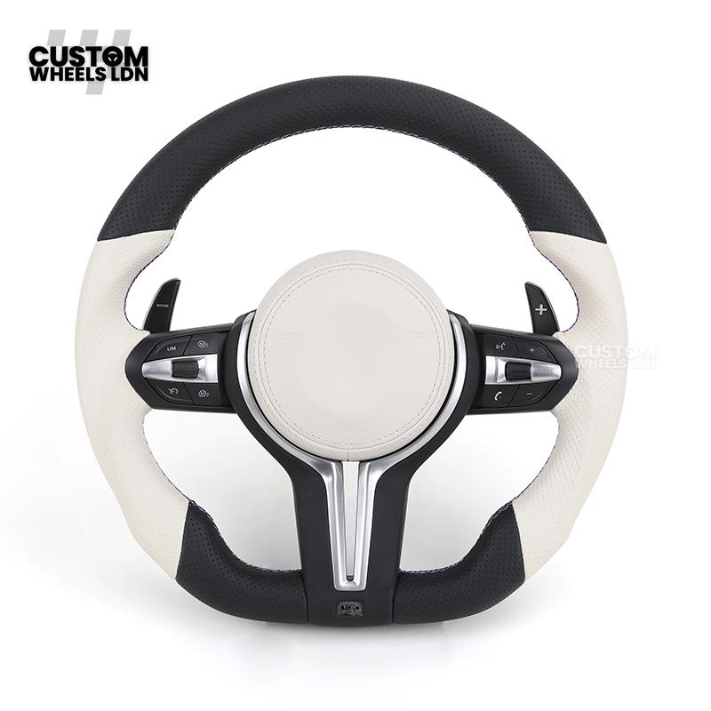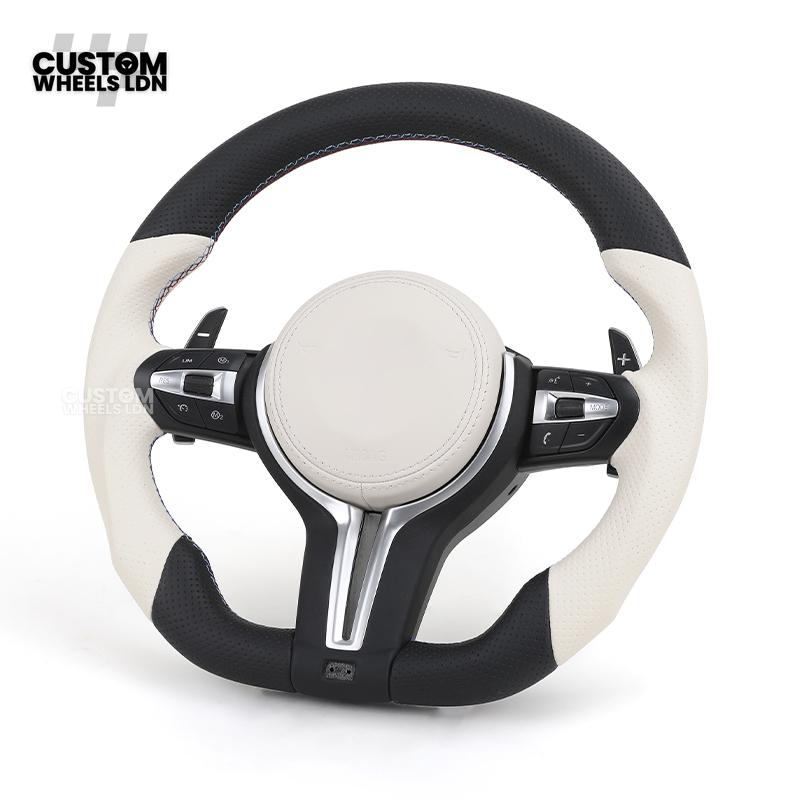 BMW Custom Flat Bottom Steering Wheel – White & Black Perforated Leather with M-Stitching | Fits F20 F22 F30 F32 F36 F10 F06 F13 X1 X3 X4 X5 X6 + More