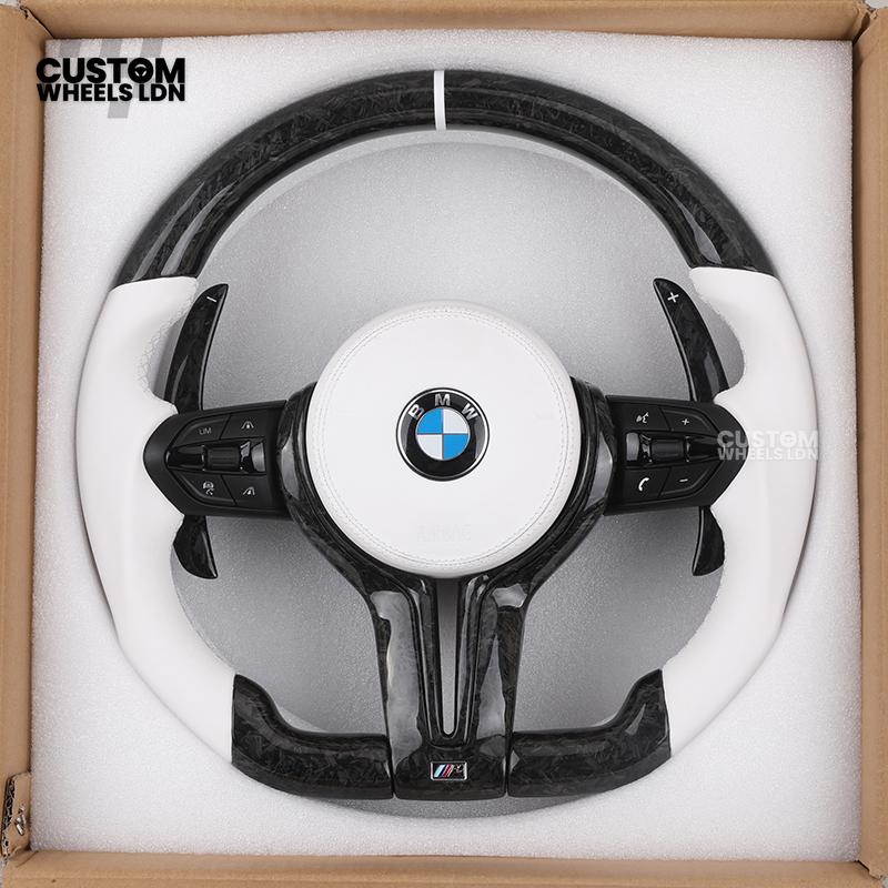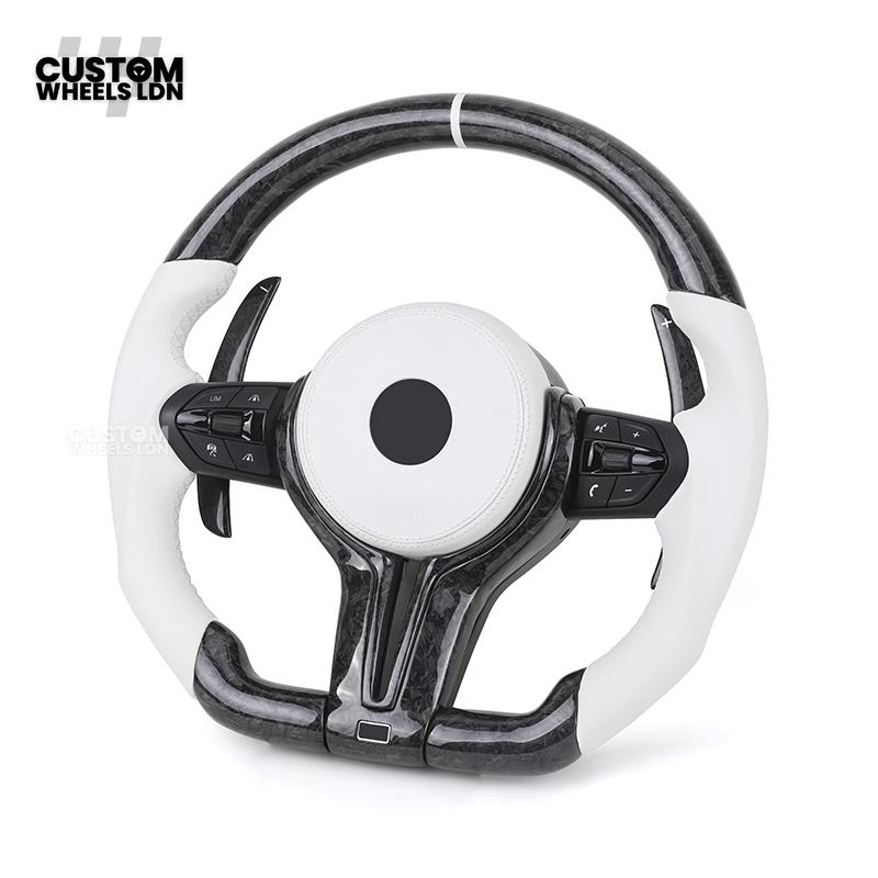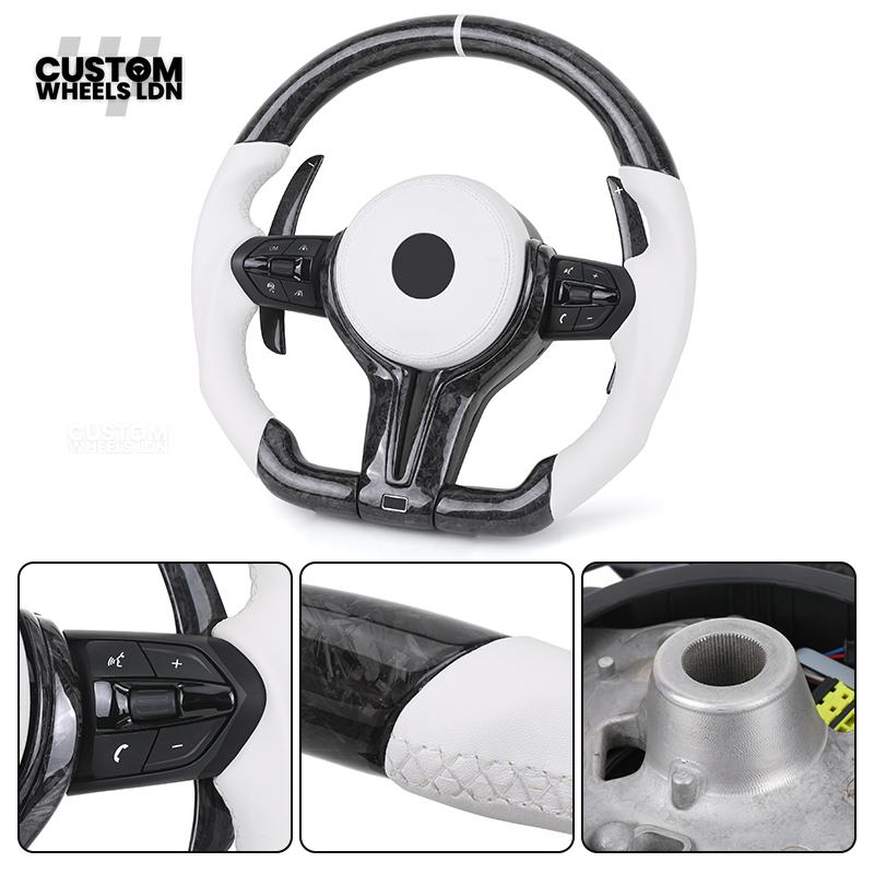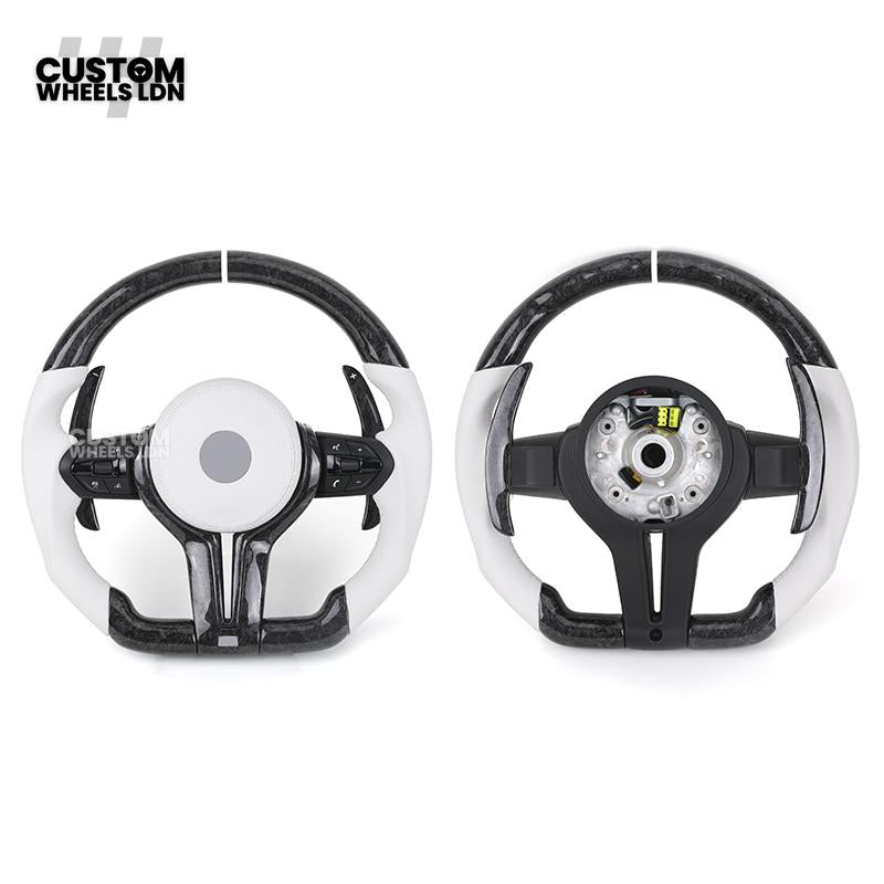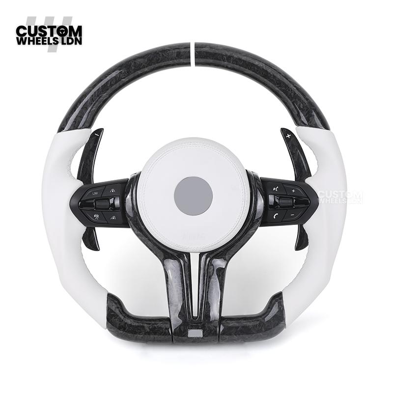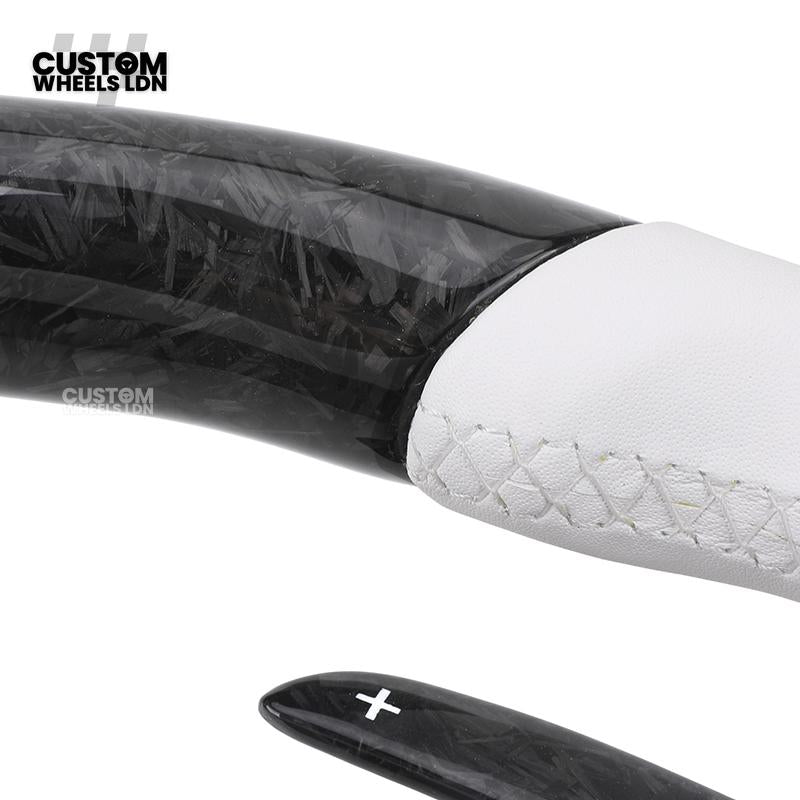 BMW Forged Carbon & White Leather Steering Wheel | Paddle Shifters | M Badge | Flat Bottom | Fits 1 2 3 4 5 Series (F & E Series) + more | Complete Plug & Play
