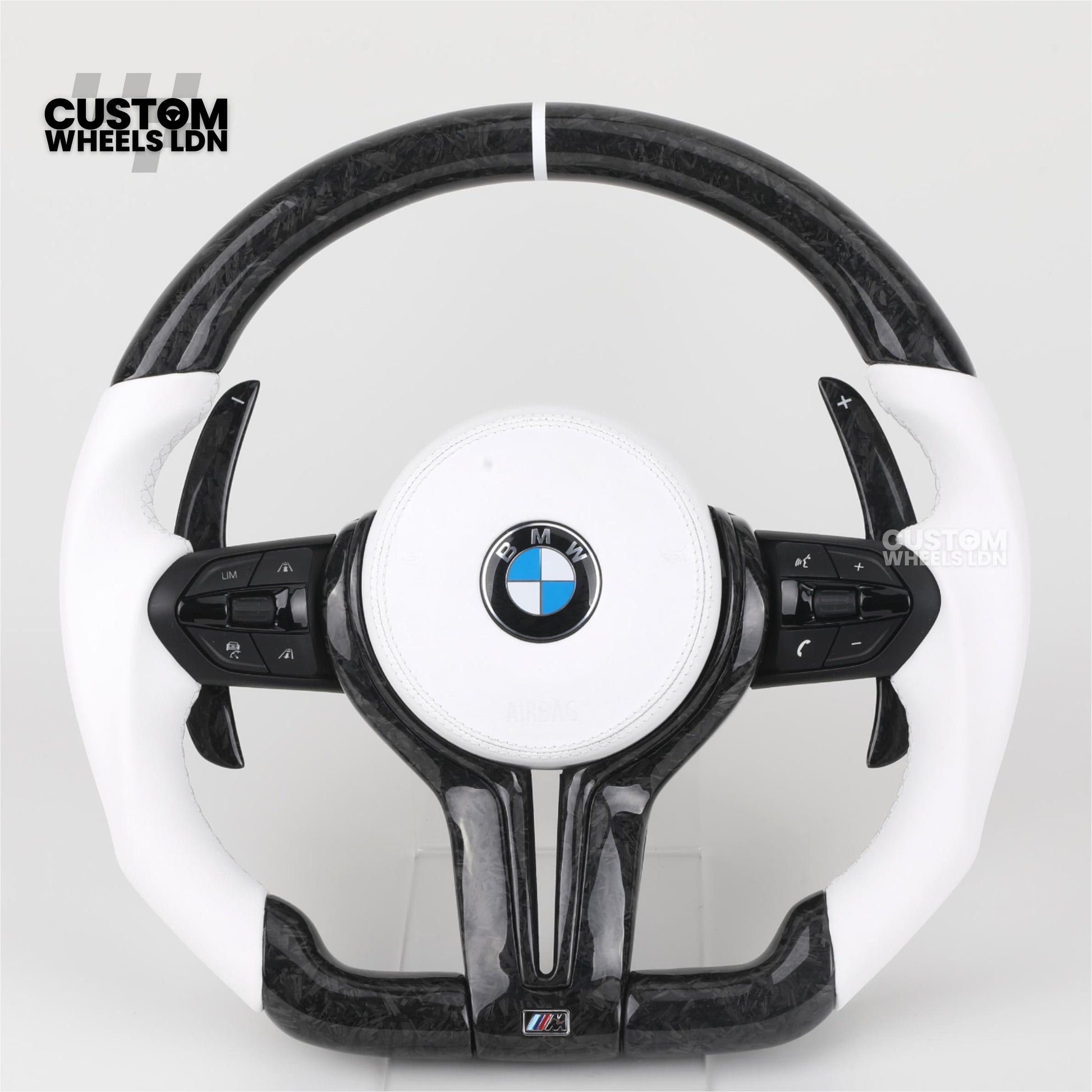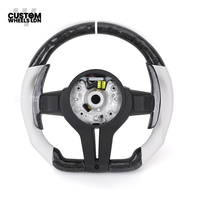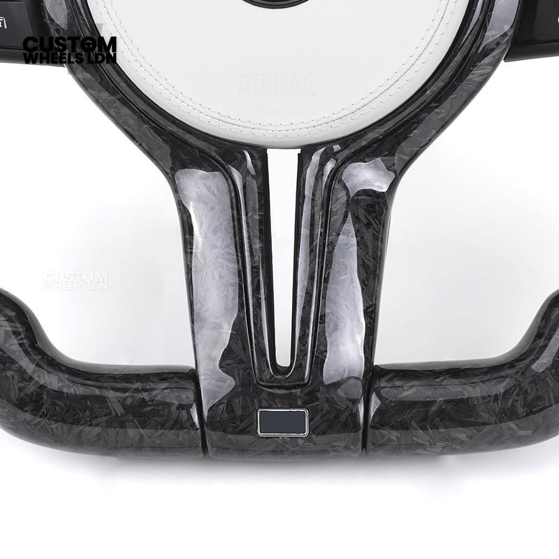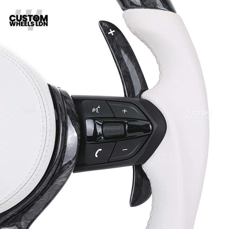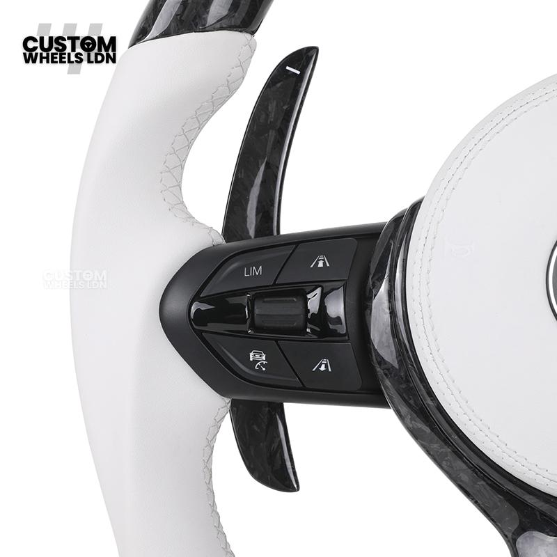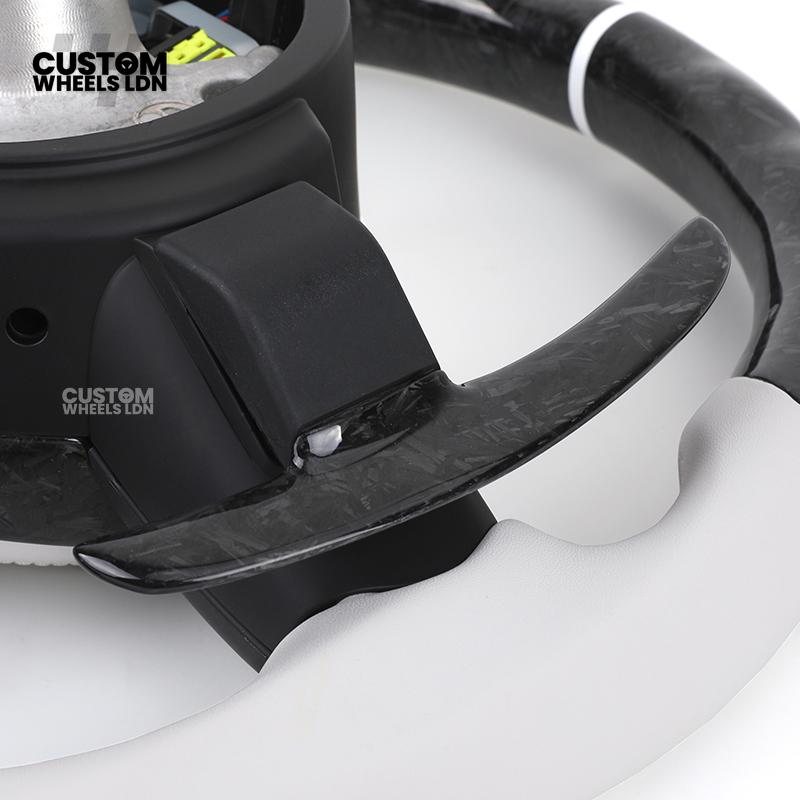 BMW Forged Carbon & White Leather Steering Wheel | Paddle Shifters | M Badge | Flat Bottom | Fits 1 2 3 4 5 Series (F & E Series) + more | Complete Plug & Play