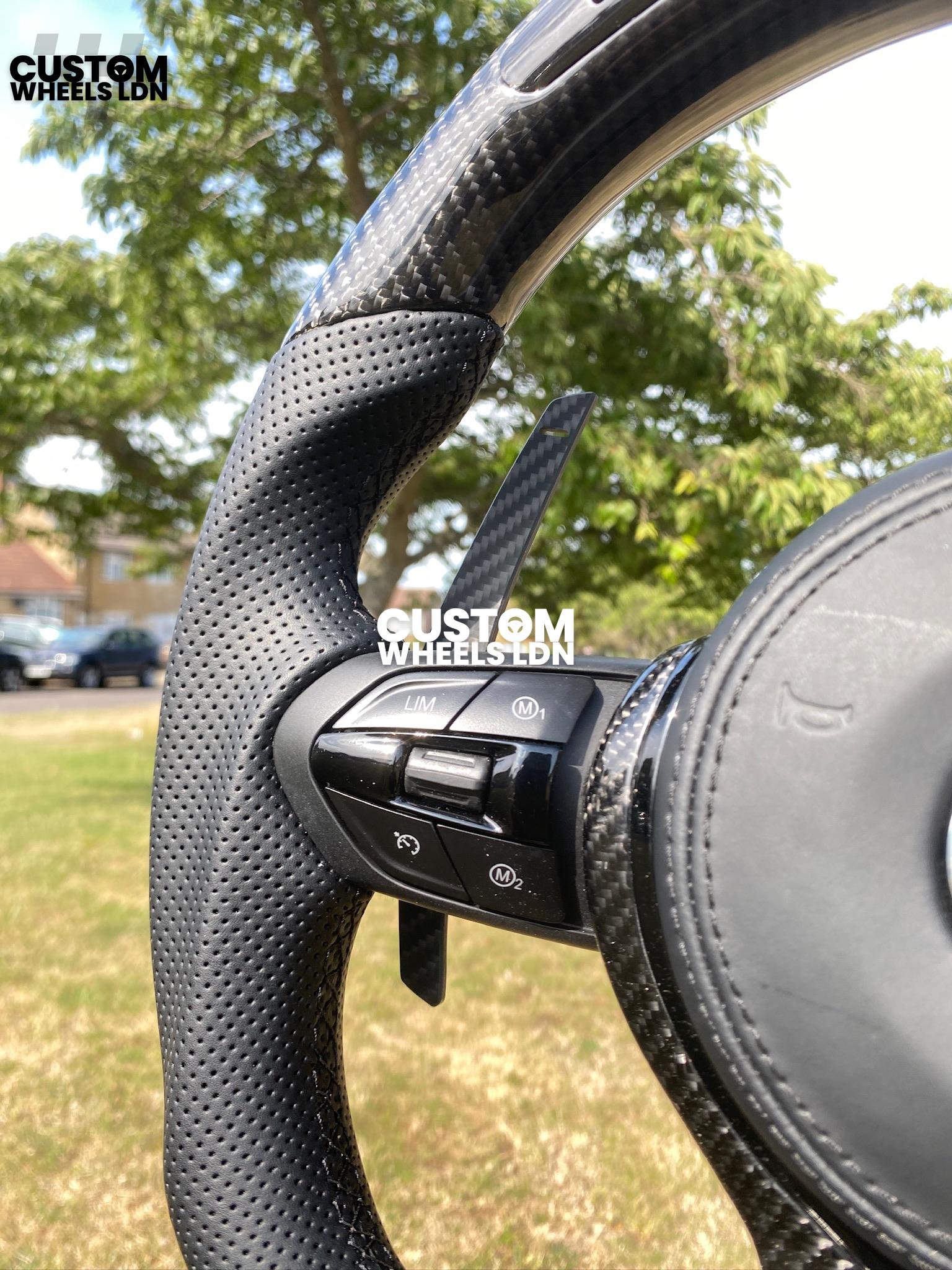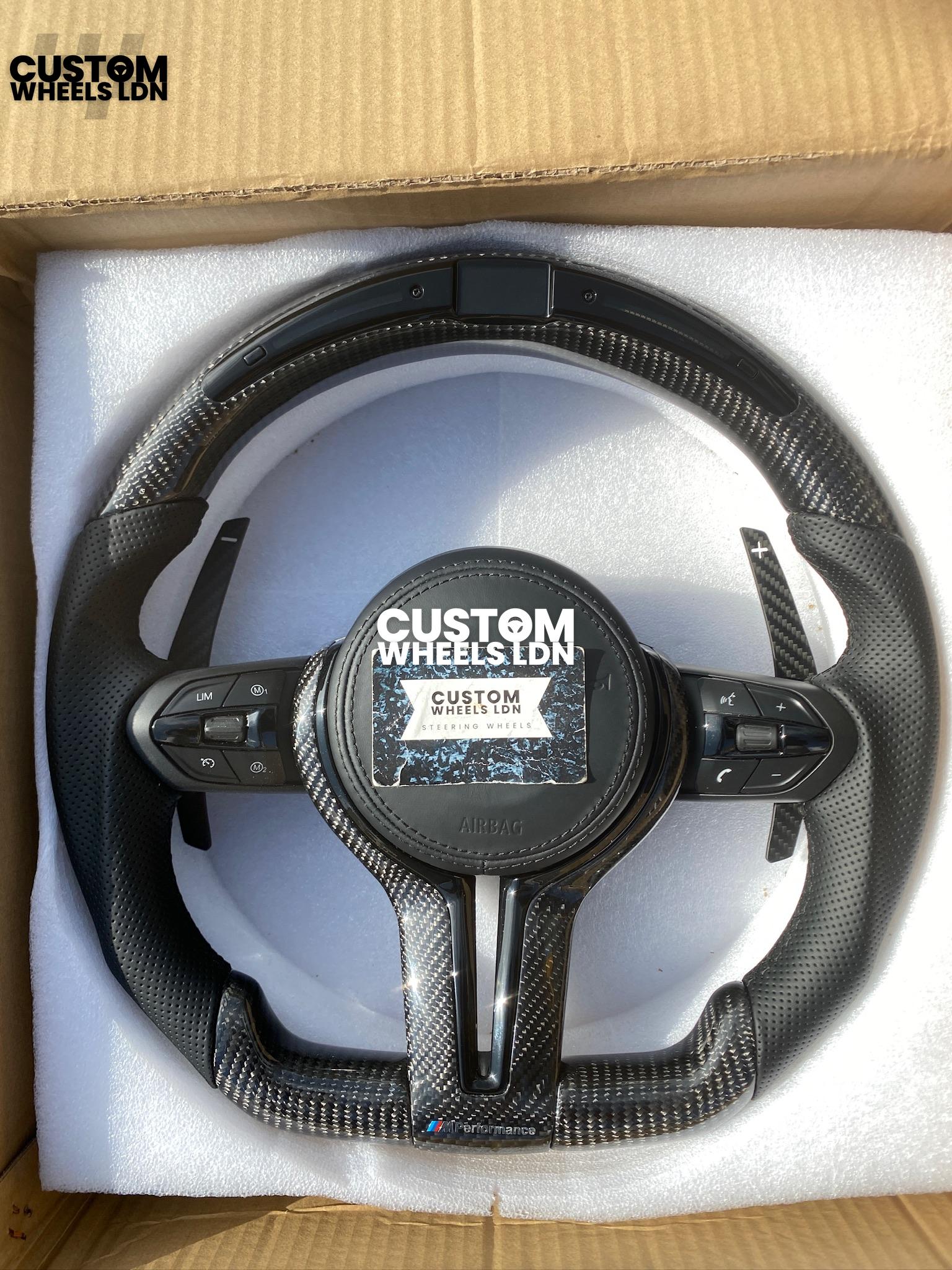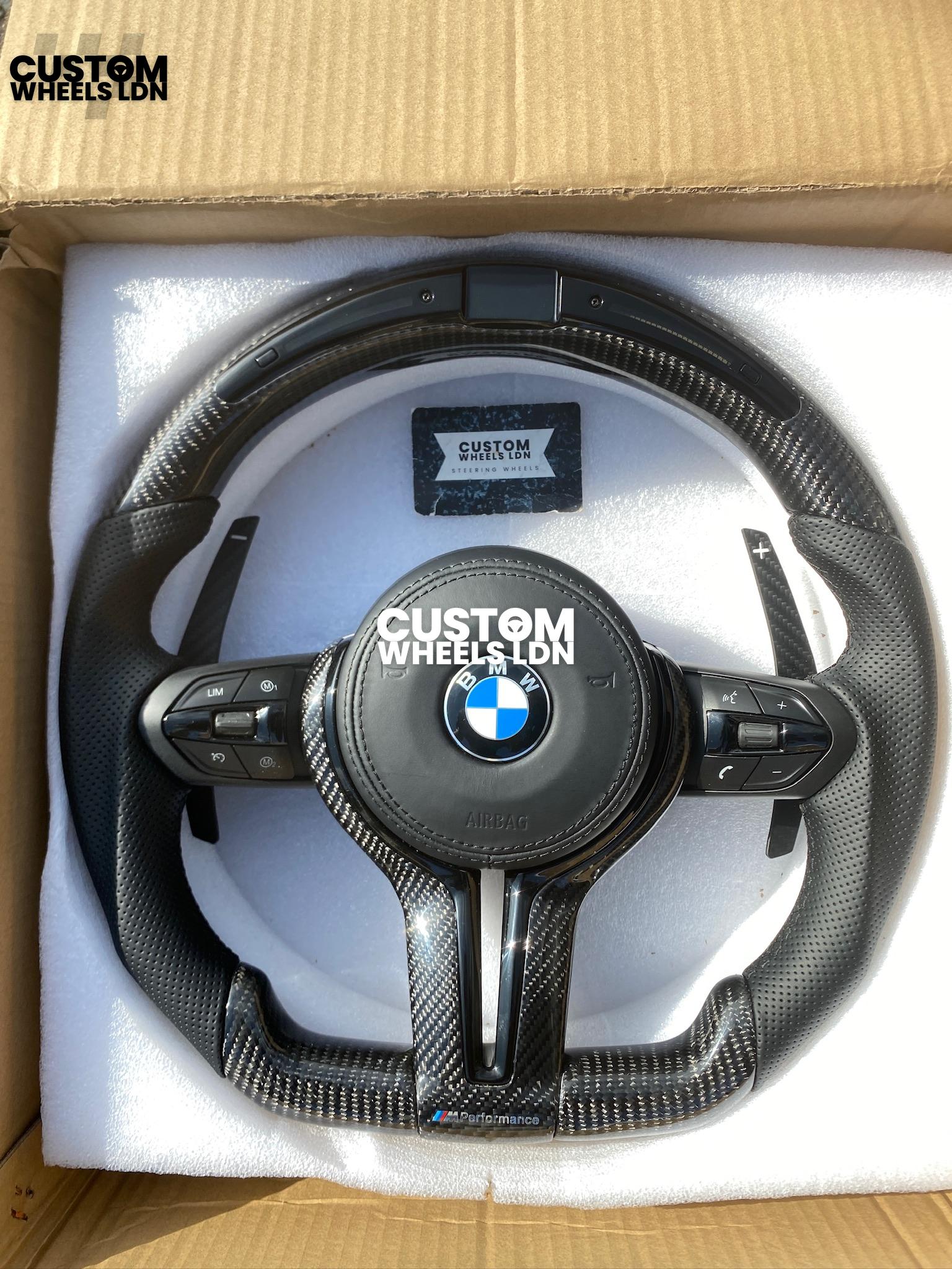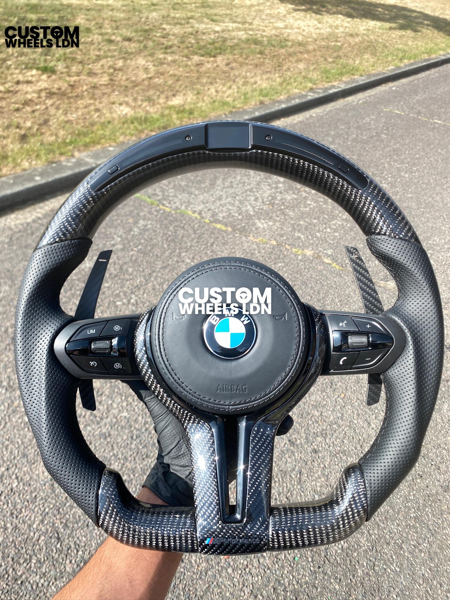BMW Custom Flat Bottom Steering Wheel – Led rev display, Gloss Carbon Fibre, Magnetic Paddles, All-Black OEM Buttons | Fits F Series, G Series + more | Plug & Play | With Airbag | Upgrade for Older Models Available