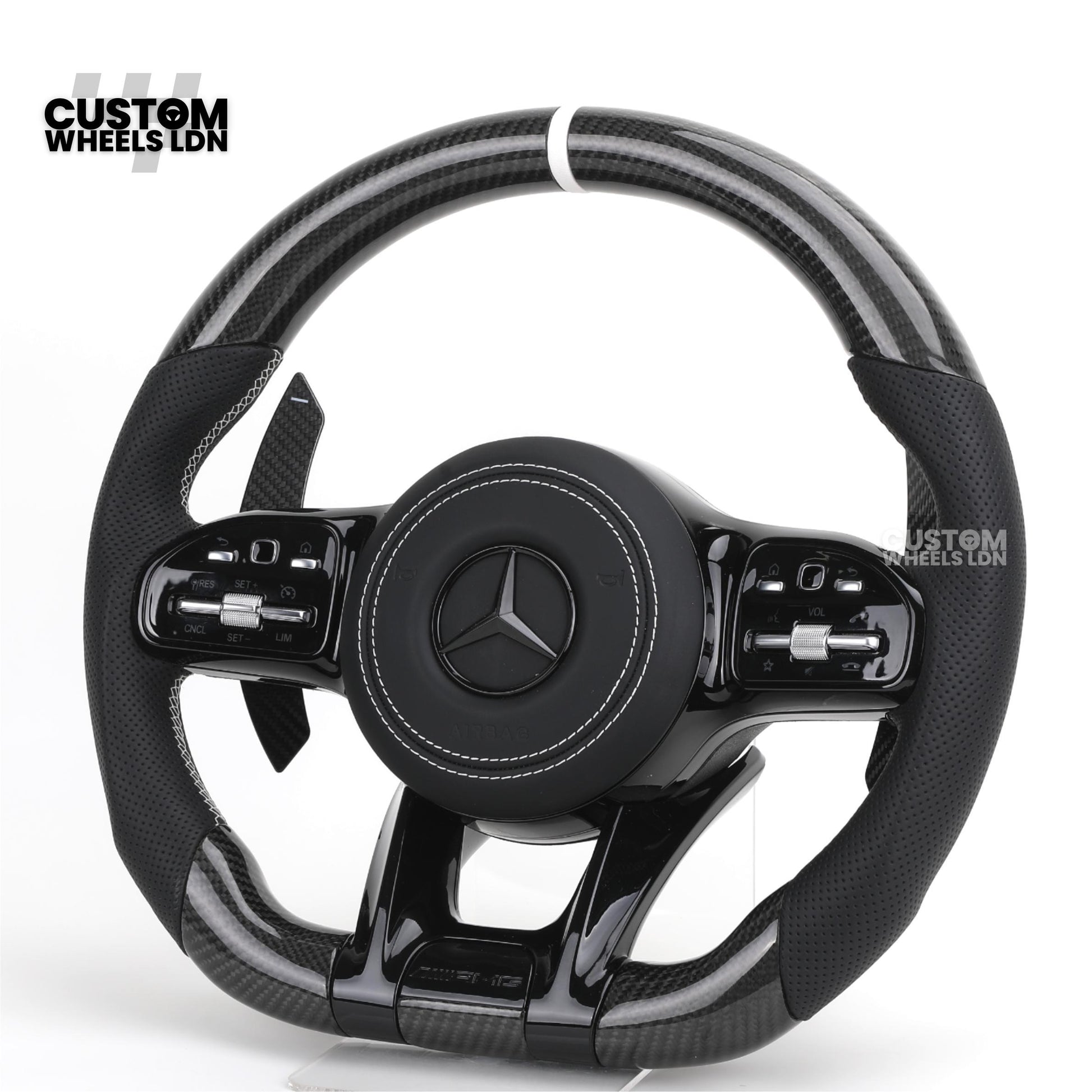 Mercedes Custom AMG Steering Wheel Carbon Fibre & Piano Black | White Stitching | AMG Style | Paddle Shifters | Complete Retrofit | Fits W205, W176, W213, A-Class, C-Class, CLA + more