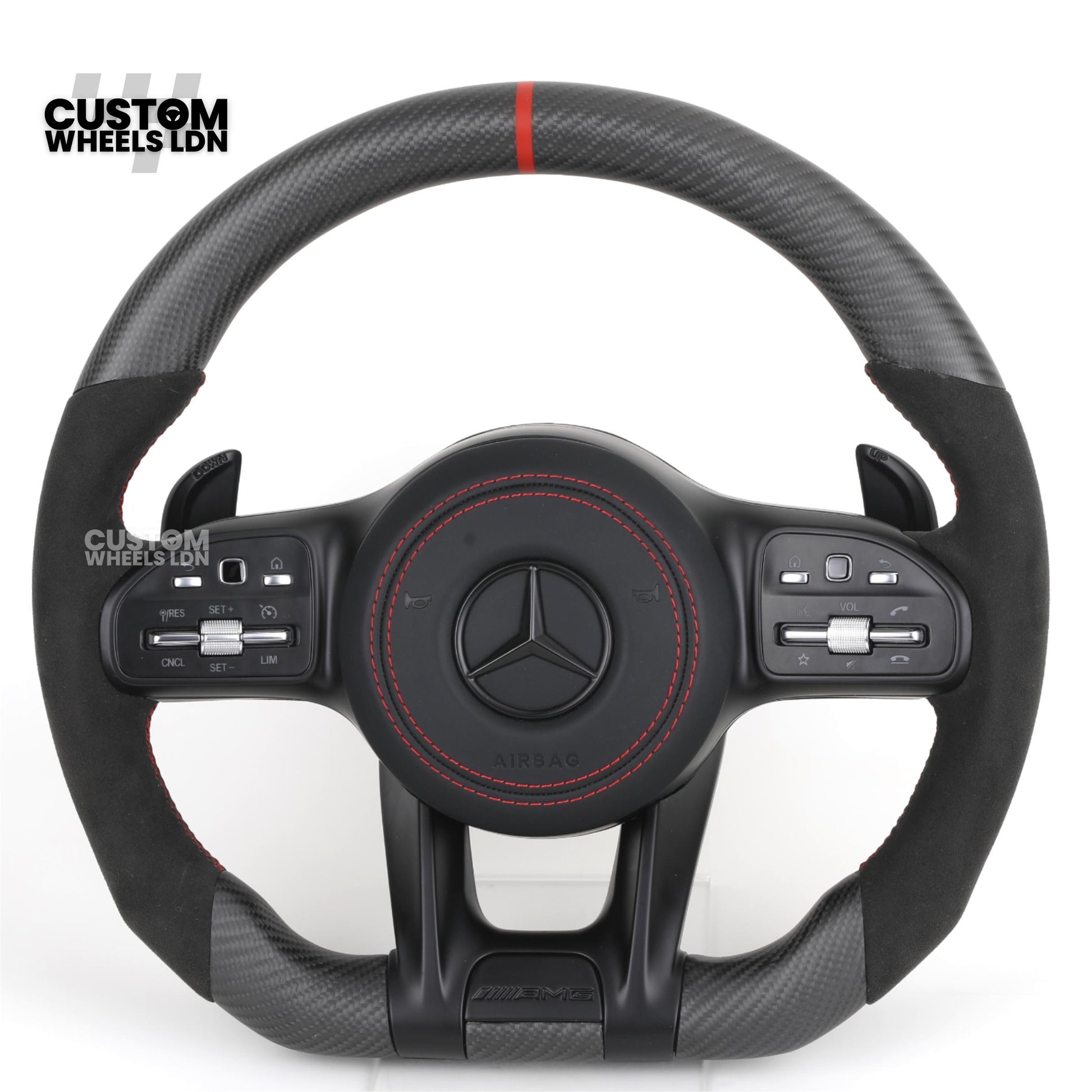 Mercedes Custom AMG Steering Wheel Flat Bottom Alcantara + Satin Carbon | Red Stitching & Marker | Complete Retrofit | Fits C-Class, E-Class, GLC, CLA, GLS, W205, W213, W222 + more