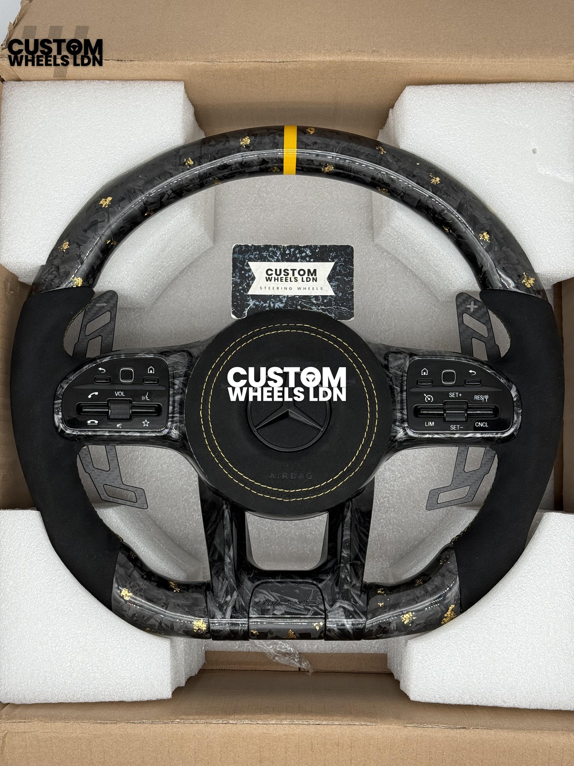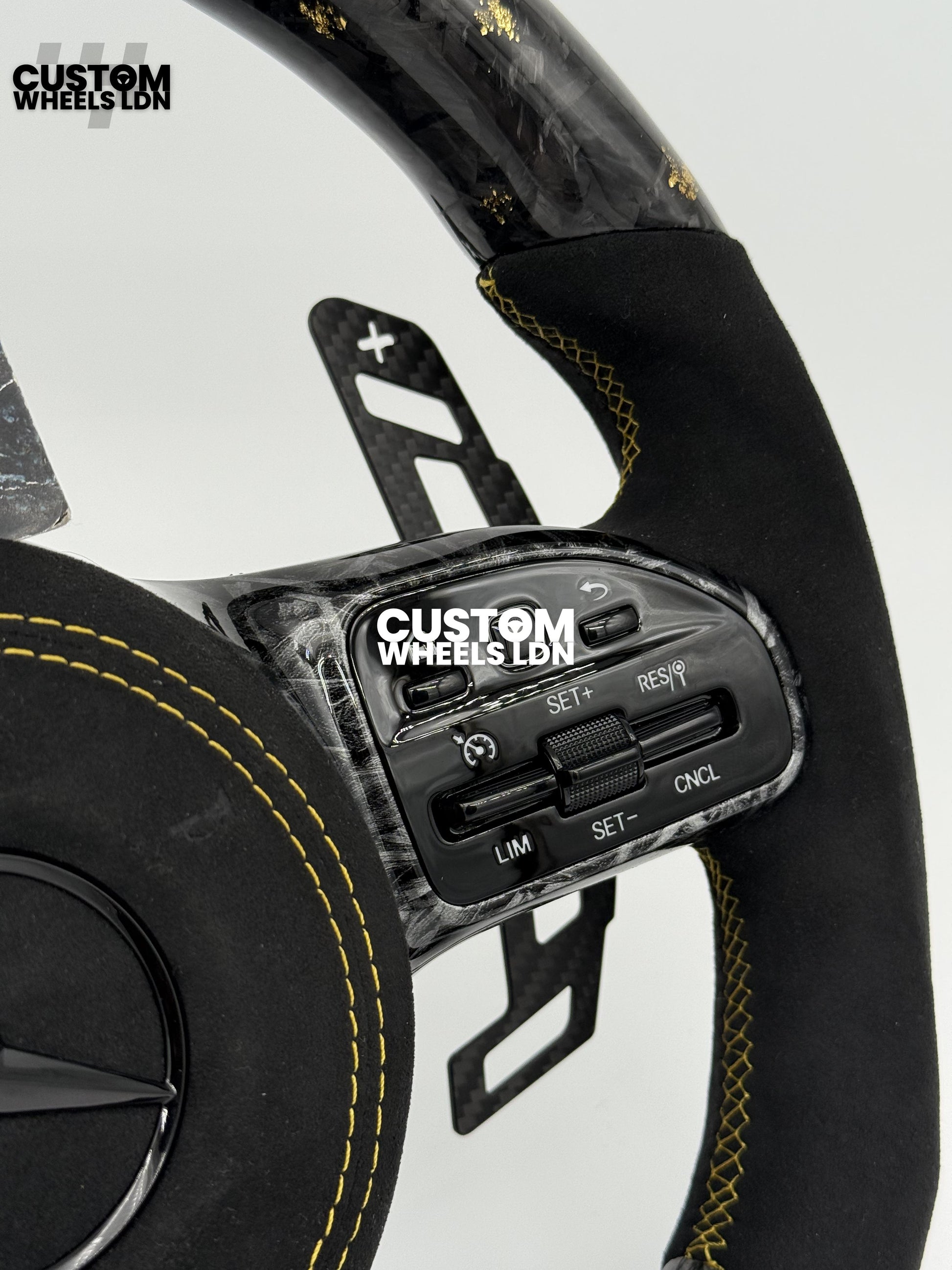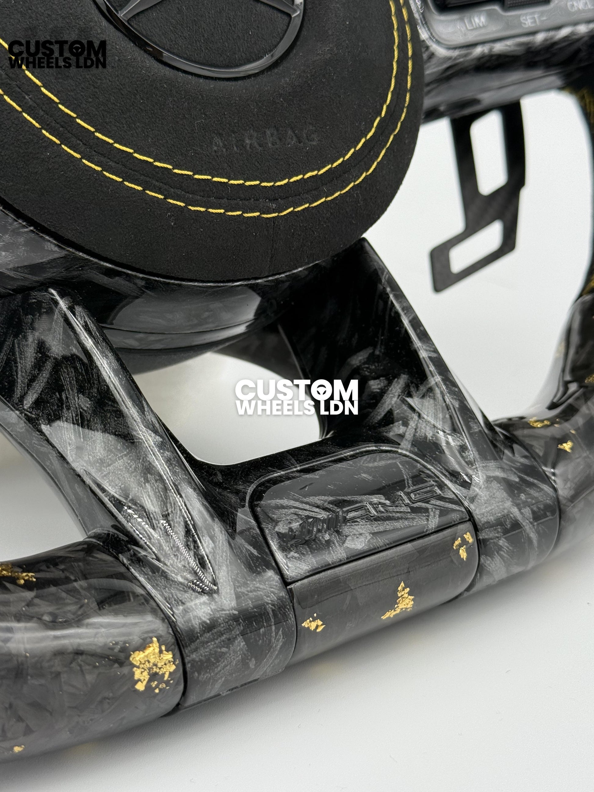 Mercedes Custom Gold Flake Forged Carbon Flat Bottom Steering Wheel – Magnetic Extended Paddles, OEM Black Buttons | Fits A-Class, C-Class, E-Class, GLC, GLE + more | Plug & Play | With Airbag | Upgrade for Older Models Available