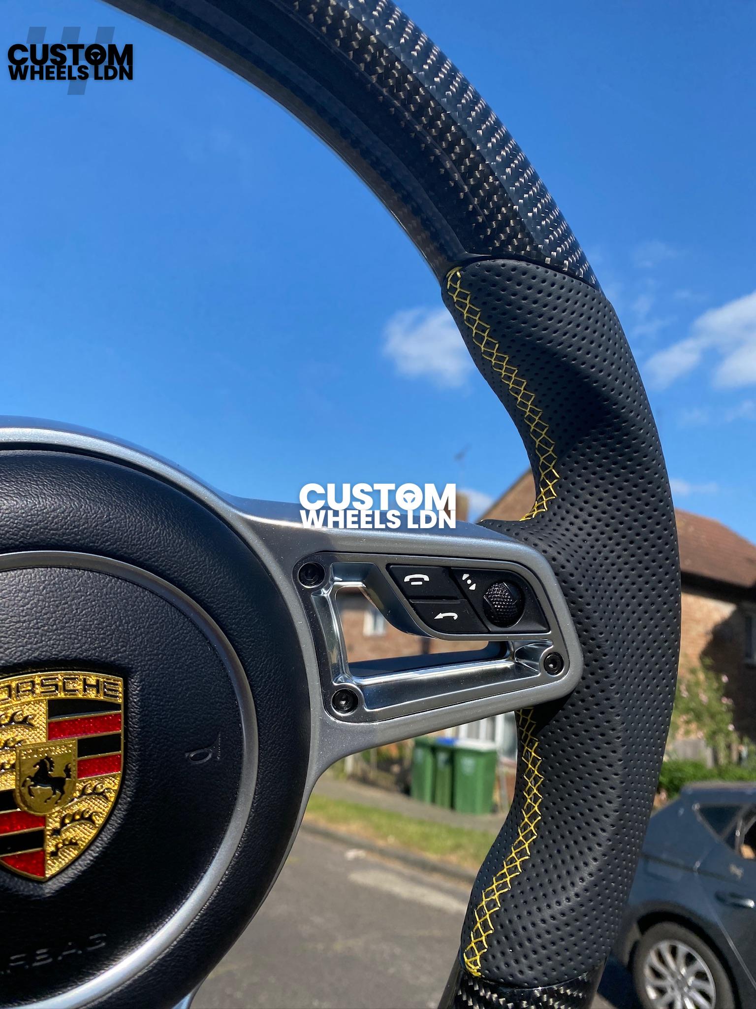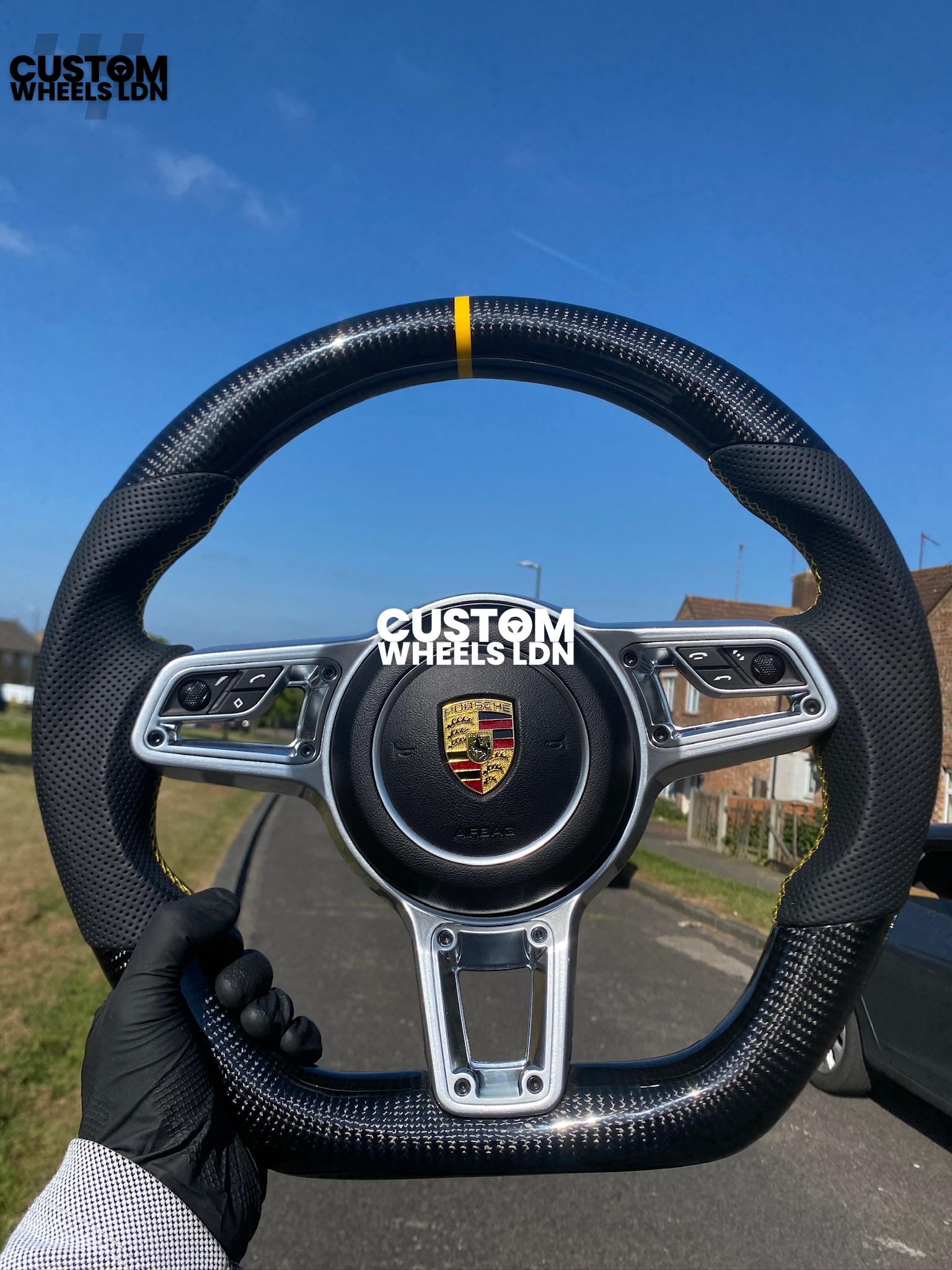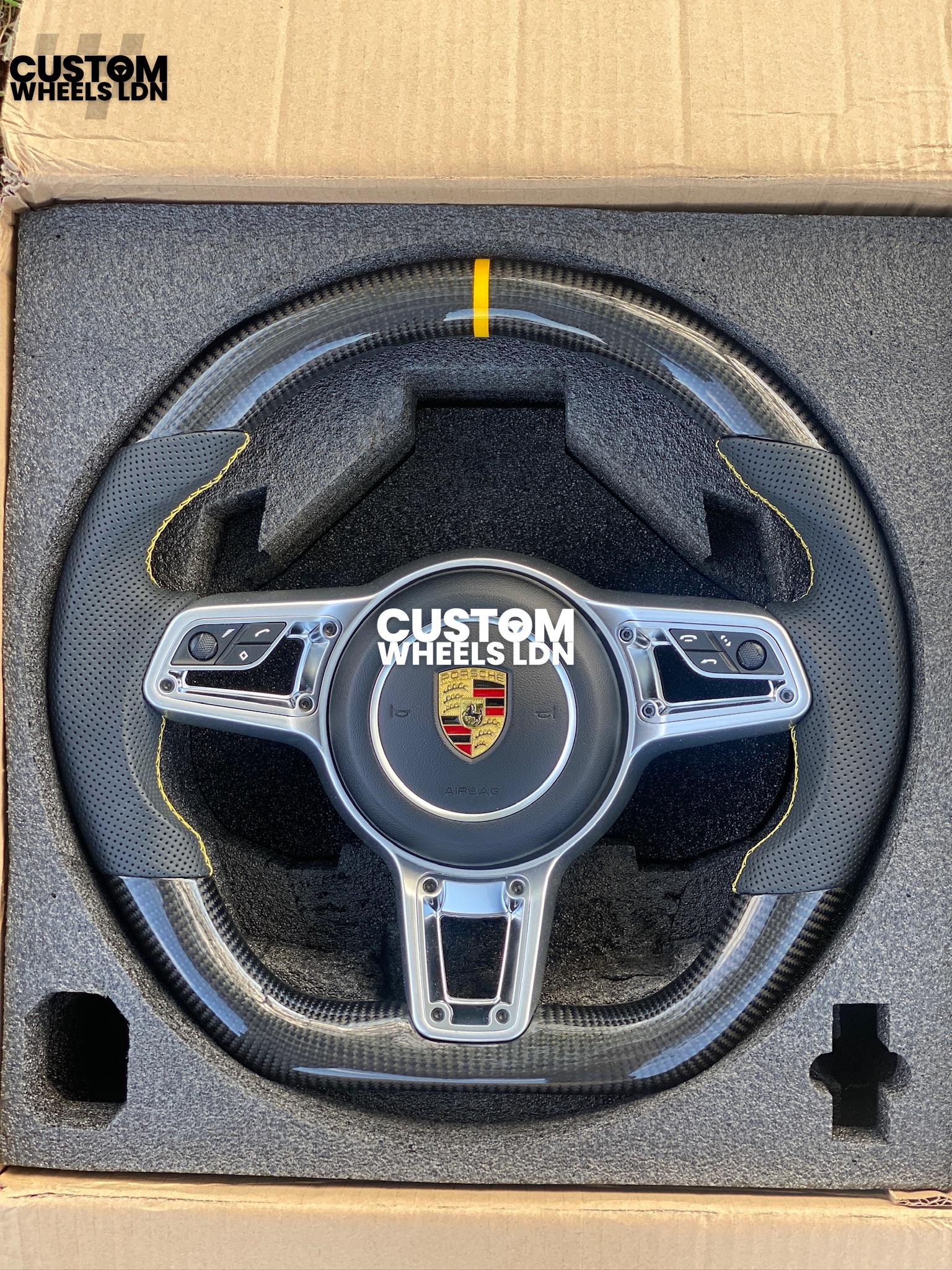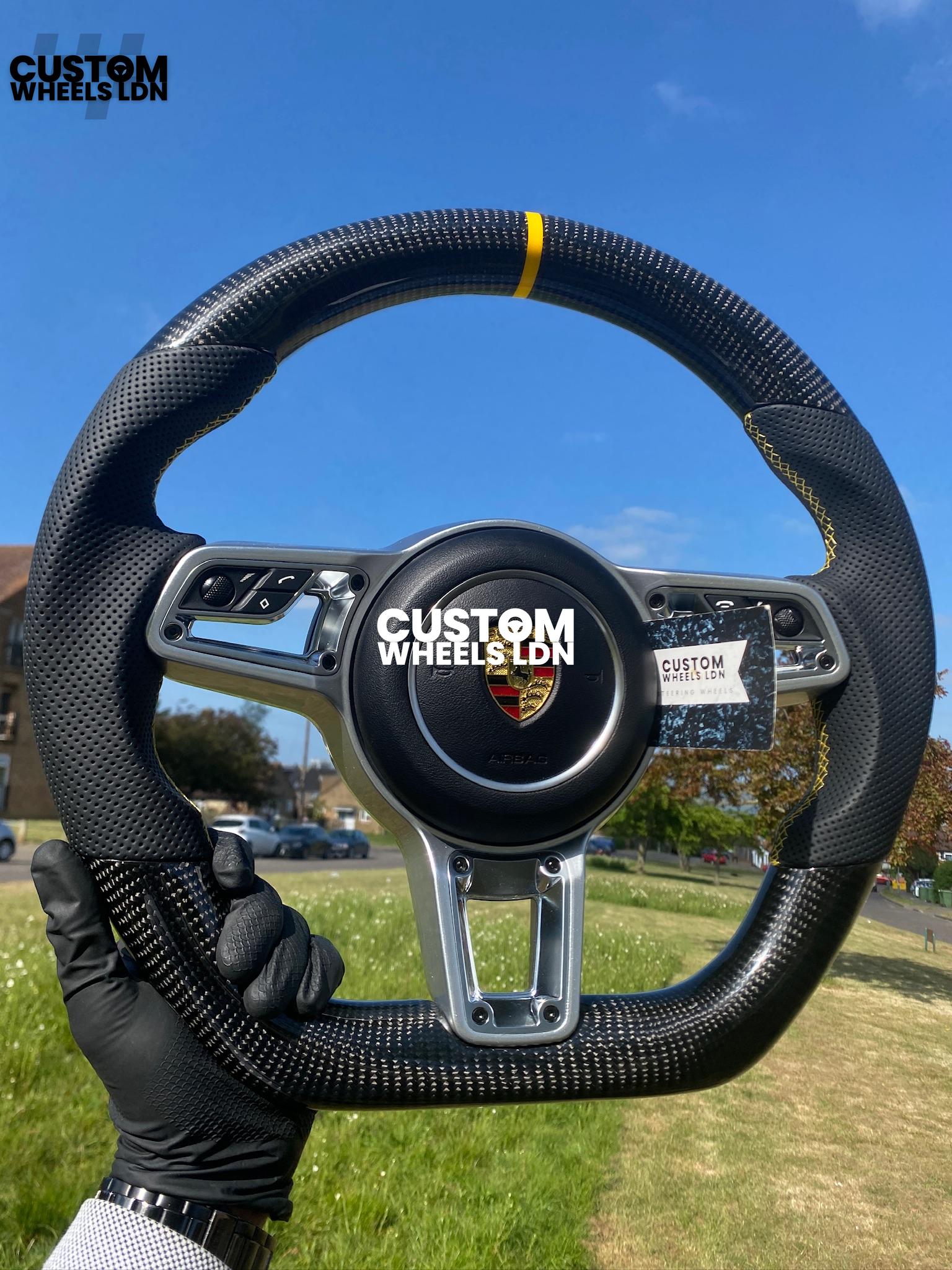 Porsche Custom Flat Bottom Steering Wheel – Gloss Carbon Fibre, Perforated Leather, Yellow Stitching & Stripe | Fits 991, 997, 981, 718, Boxster, Cayman, Macan, Panamera + more | Plug & Play | With Airbag | Upgrade for Older Models Available
