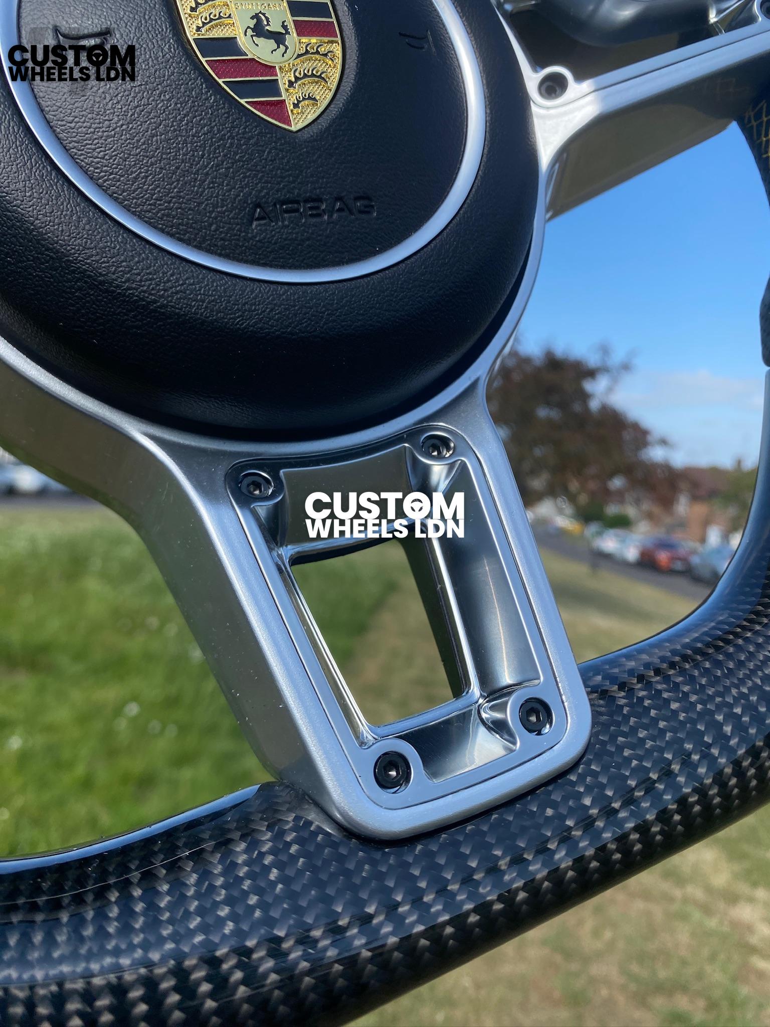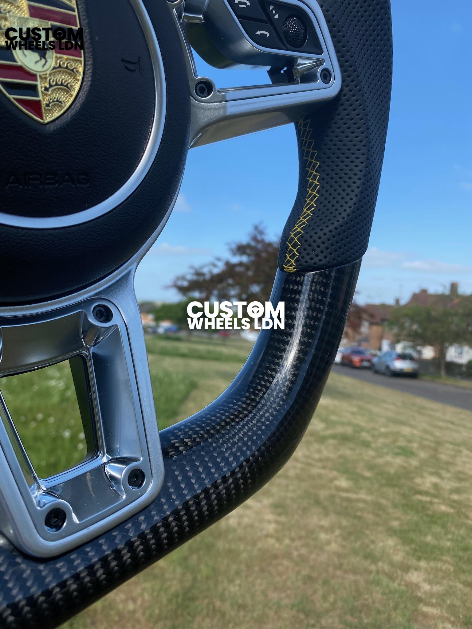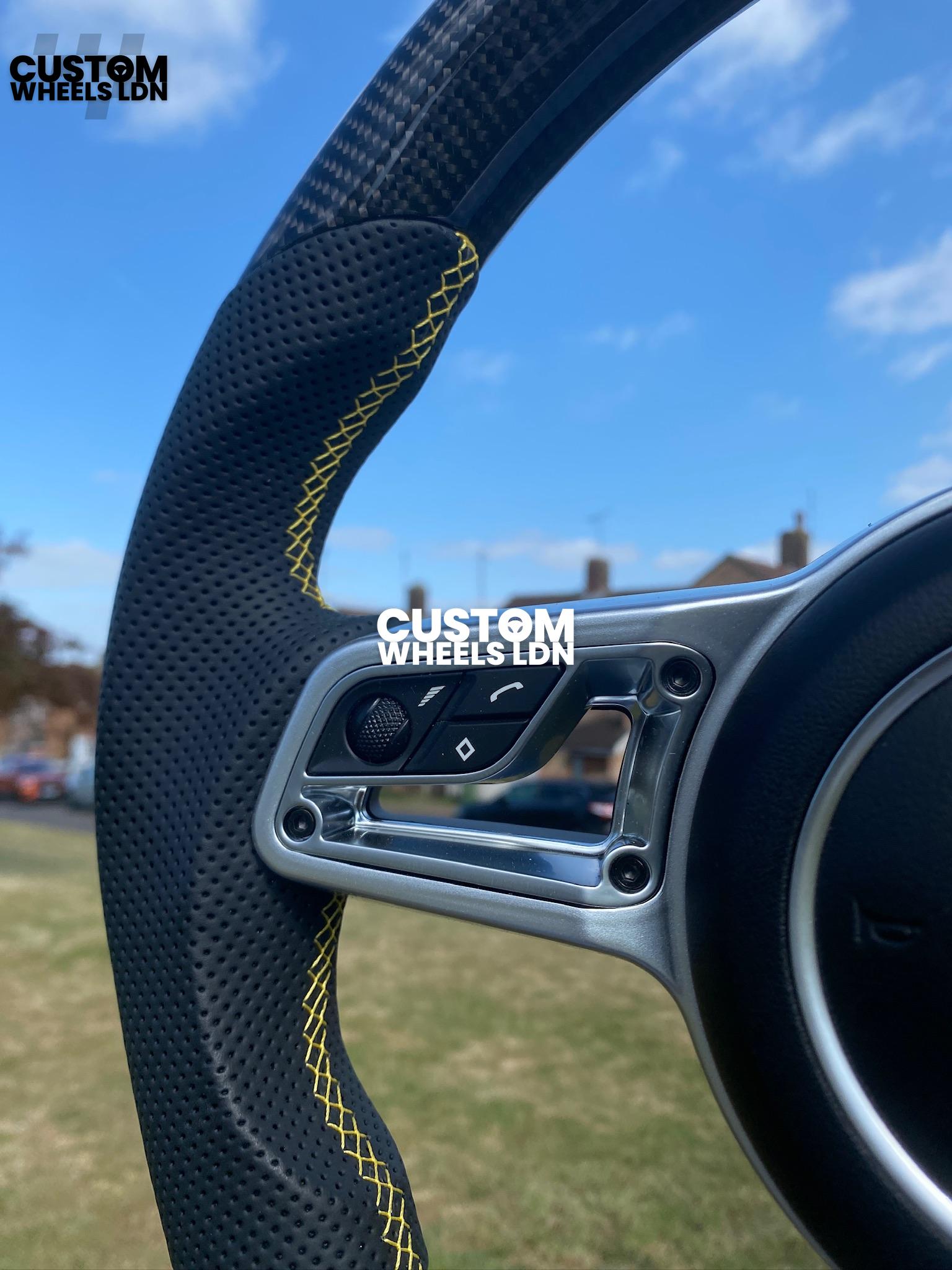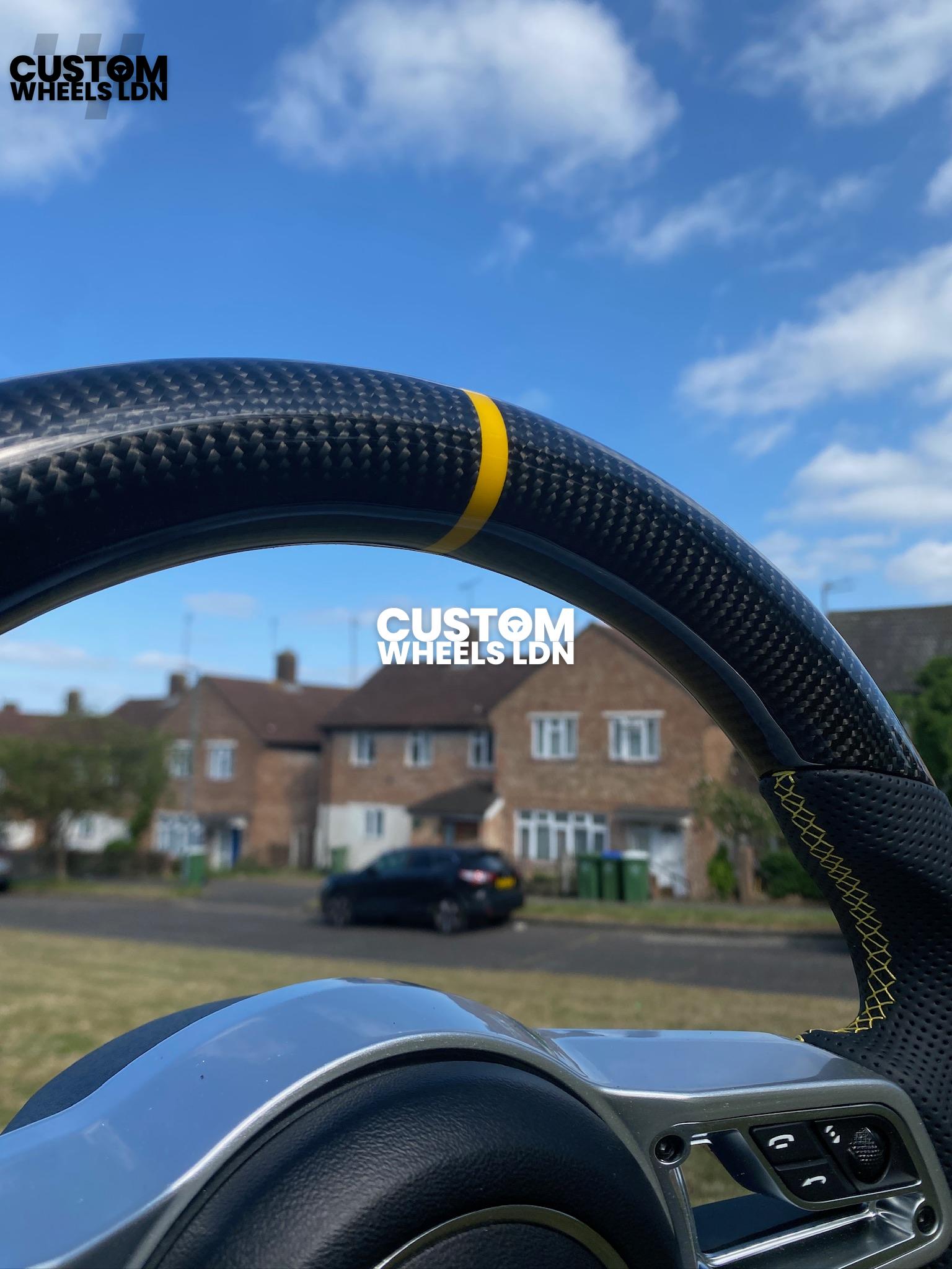 Porsche Custom Flat Bottom Steering Wheel – Gloss Carbon Fibre, Perforated Leather, Yellow Stitching & Stripe | Fits 991, 997, 981, 718, Boxster, Cayman, Macan, Panamera + more | Plug & Play | With Airbag | Upgrade for Older Models Available