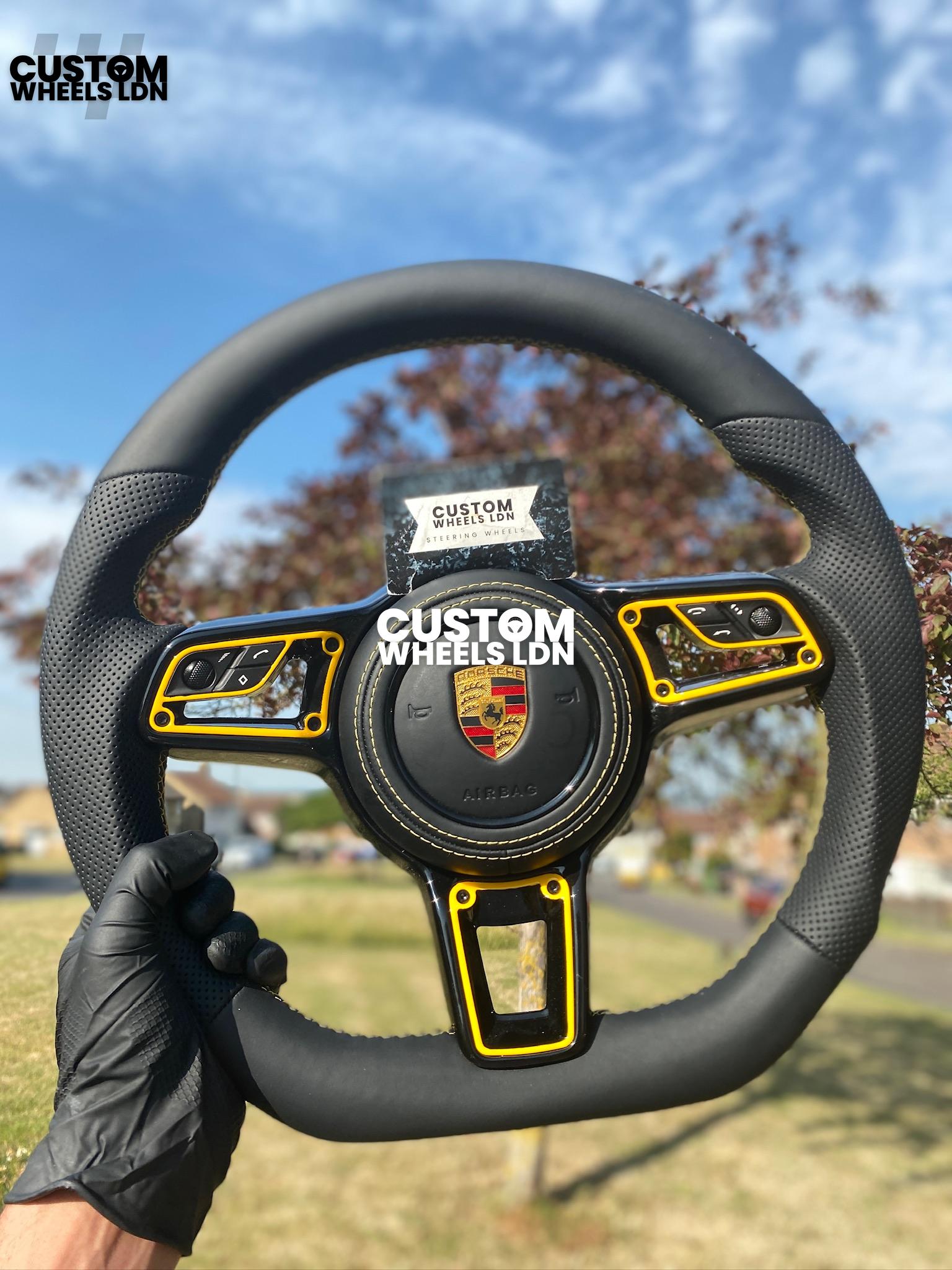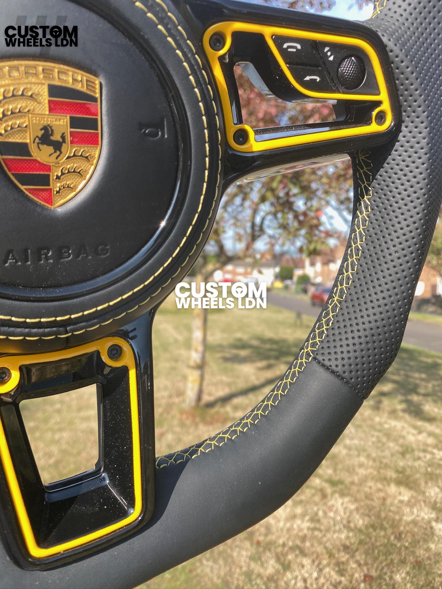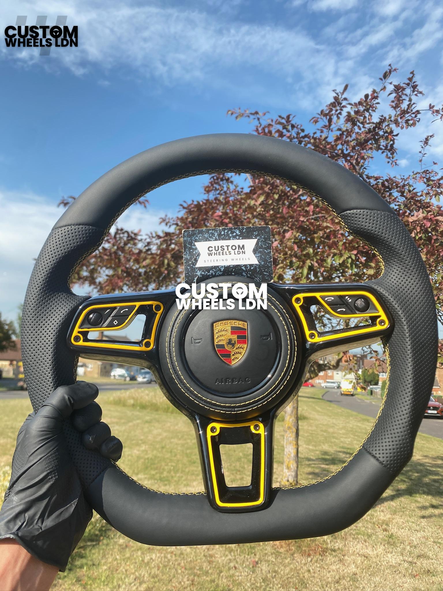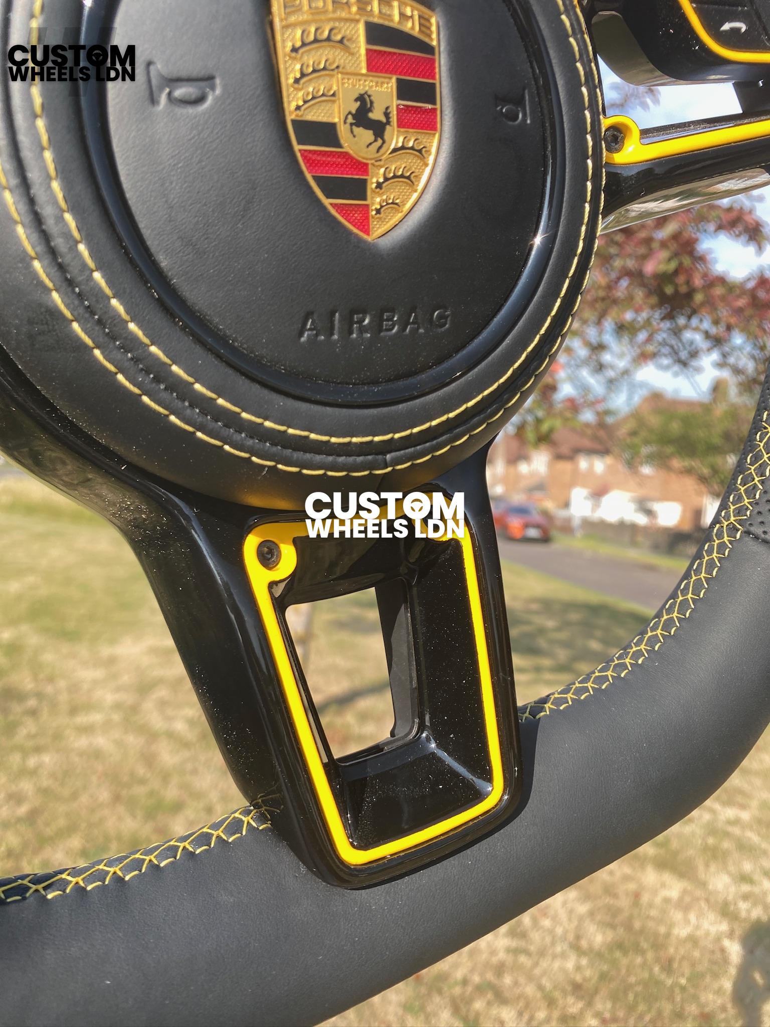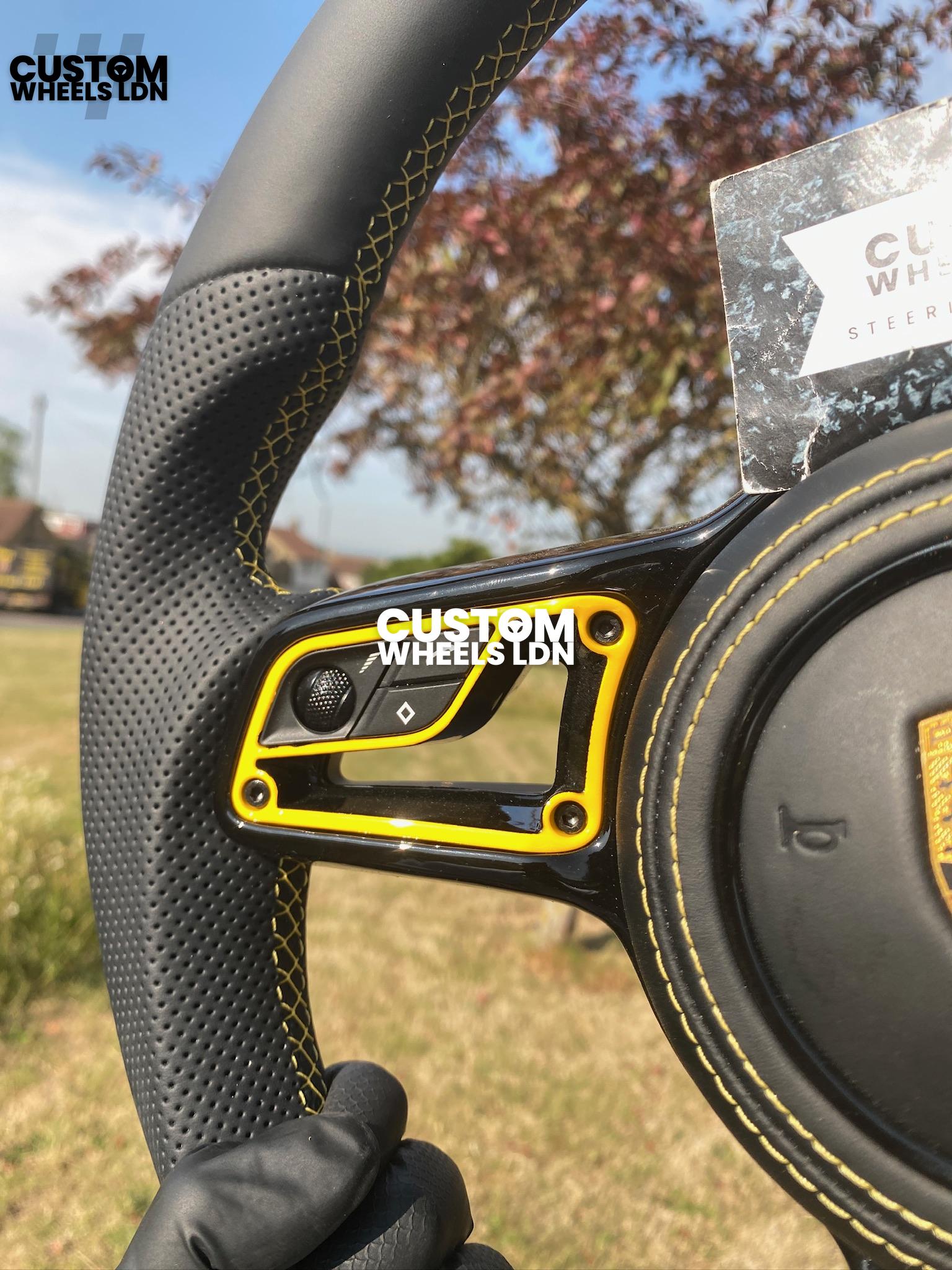 Porsche Custom Flat Bottom Steering Wheel – Smooth Leather & Perforated Grips, Yellow Contrast Stitching, Yellow Inserts, OEM Buttons | Fits 997.1, 991.1, 987, Cayman, Boxster, Macan, Cayenne + more | Plug & Play | Upgrade for Older Models Available