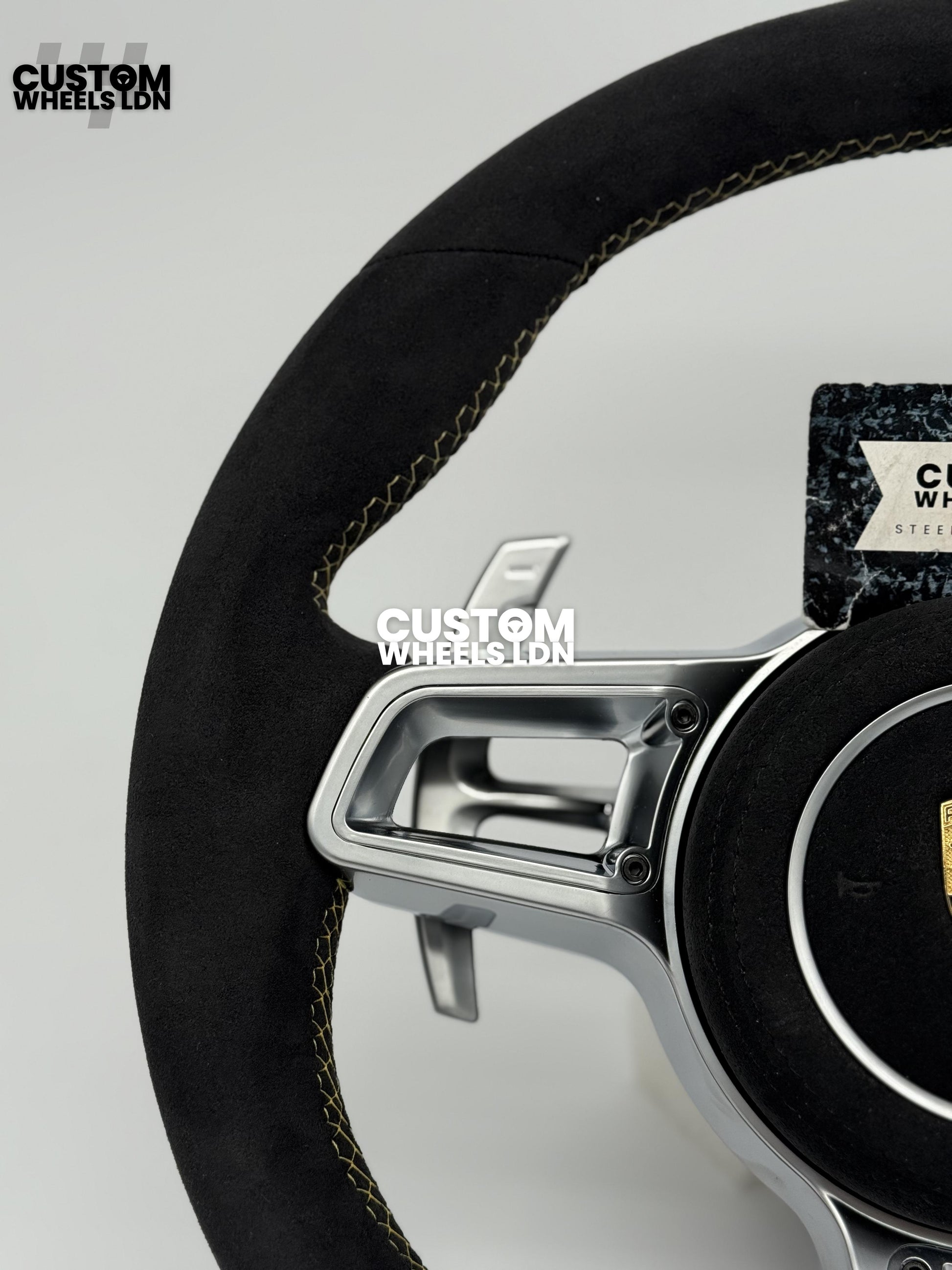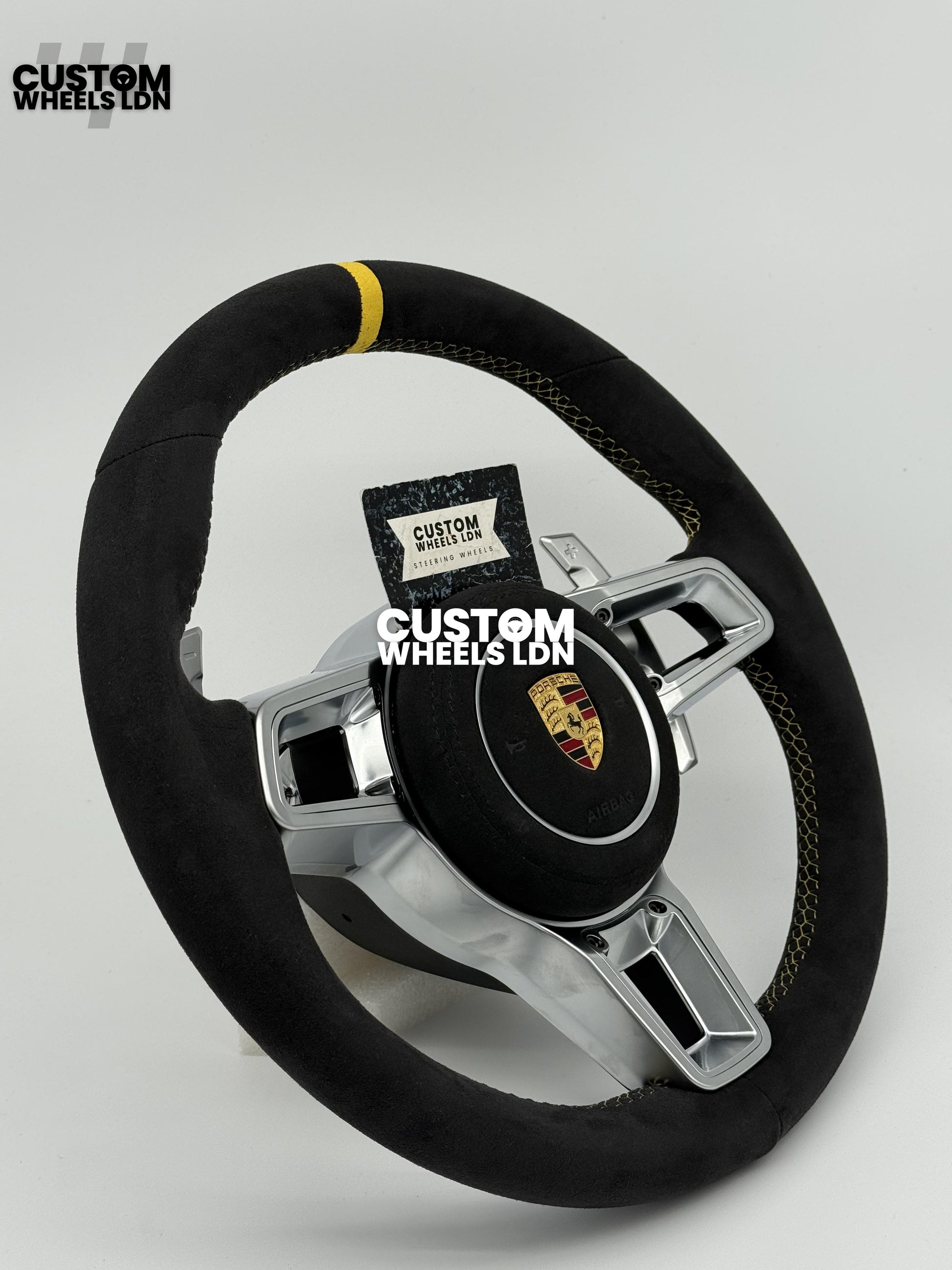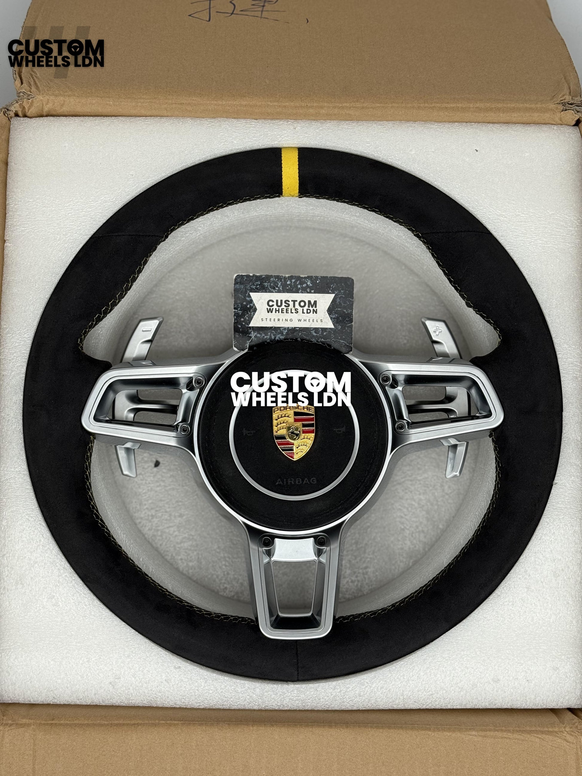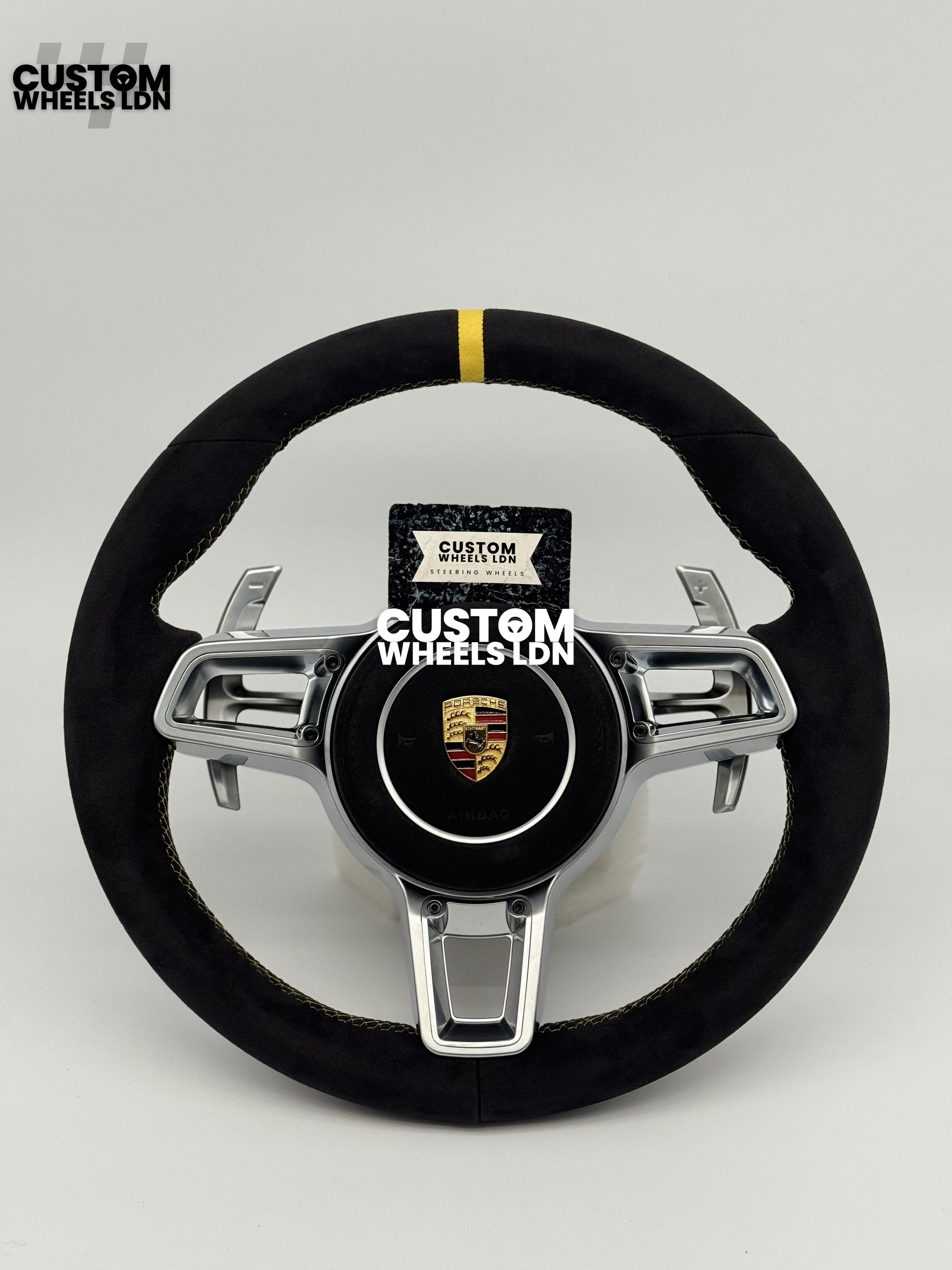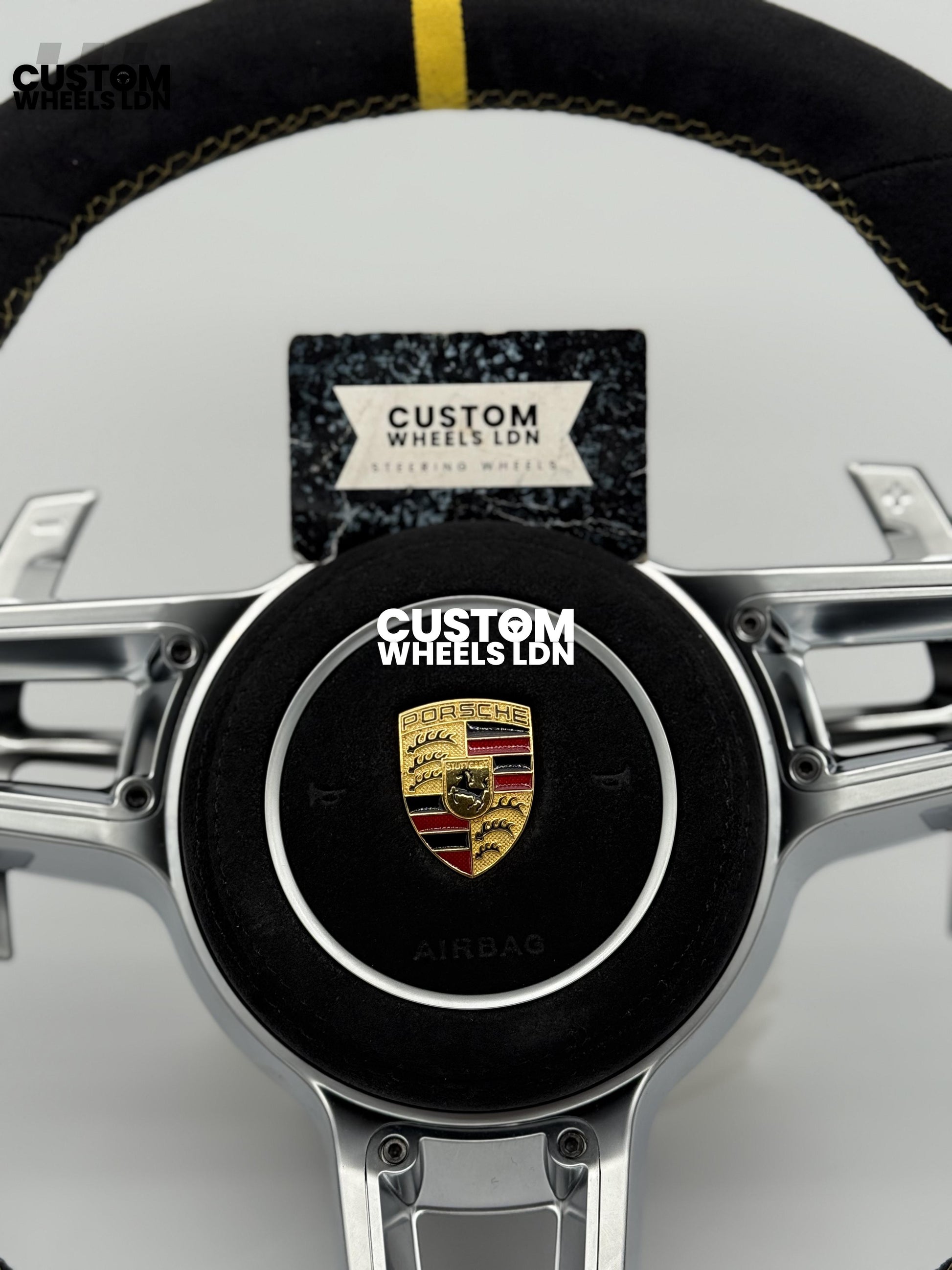 Porsche Custom GT3 RS-Style Steering Wheel – Alcantara, Yellow Stripe & Stitching, Silver Extended Paddles | Fits 997.1, 997.2, 991.1, Boxster, Cayman, Cayenne, Panamera + more | Plug & Play | With Airbag | Upgrade for Older Models Available