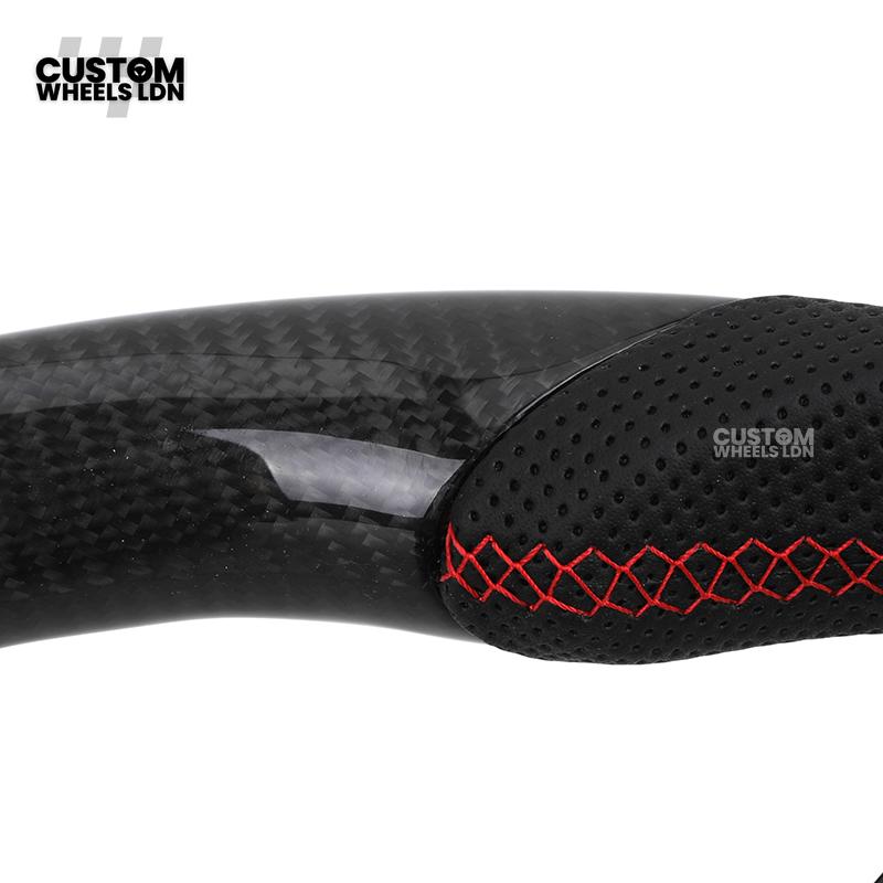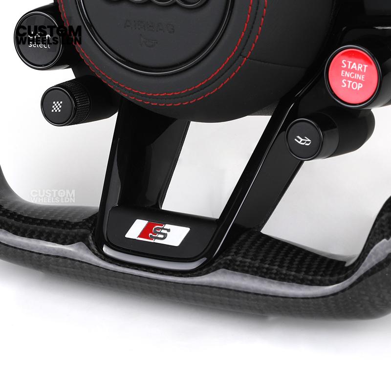 Audi Custom R8-Style Flat Bottom Steering Wheel – Carbon Top & Bottom, Red Stitching, Standard Paddles, Start Button | Fits A4, A5, S5, A6, A7, S6, S7, Q5, SQ5 + more | Plug & Play | With Airbag | Upgrade for Older Models Available