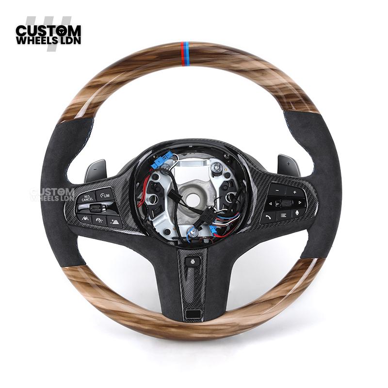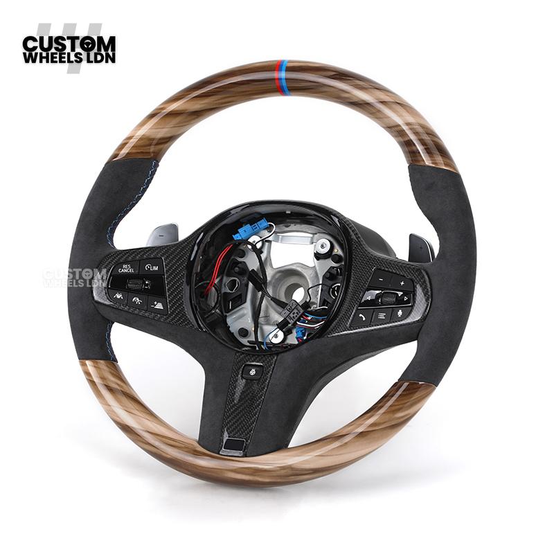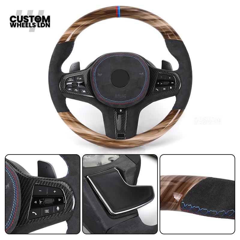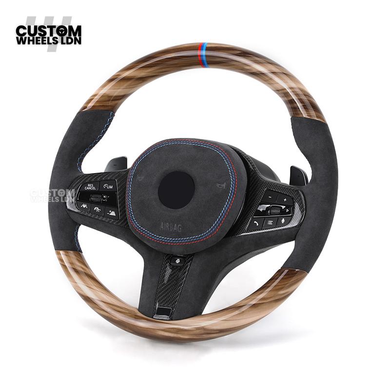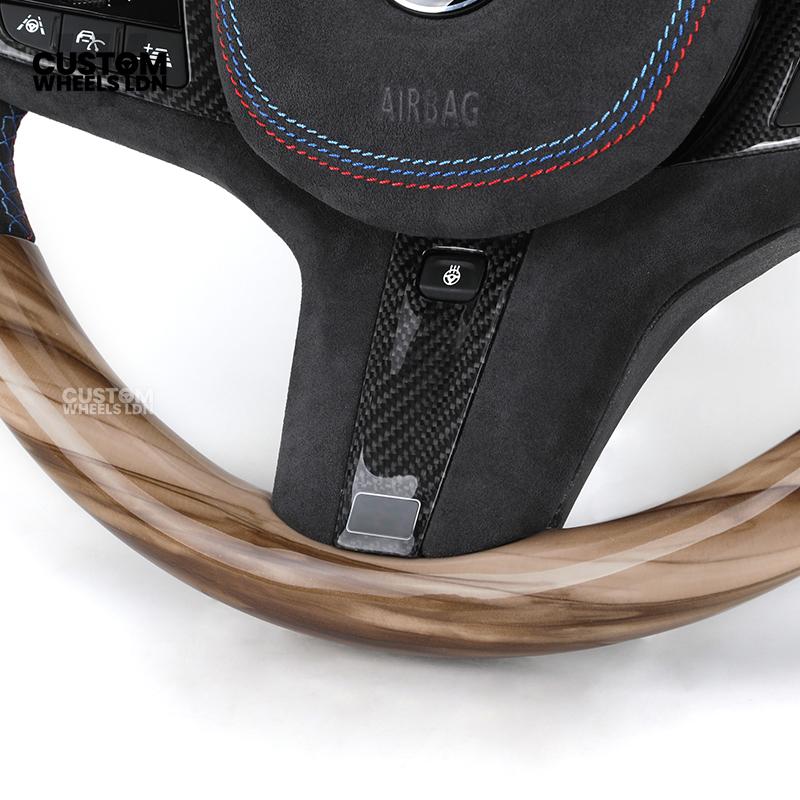 BMW Custom G-Series Steering Wheel – Gloss Wood Carbon, Flat Bottom, Alcantara Airbag – Fits G20 G21 G22 G30 G15 G05 G07 + more