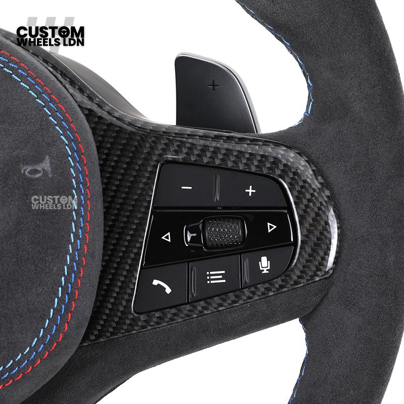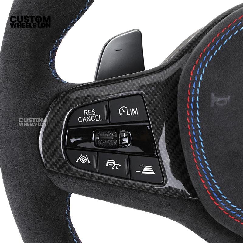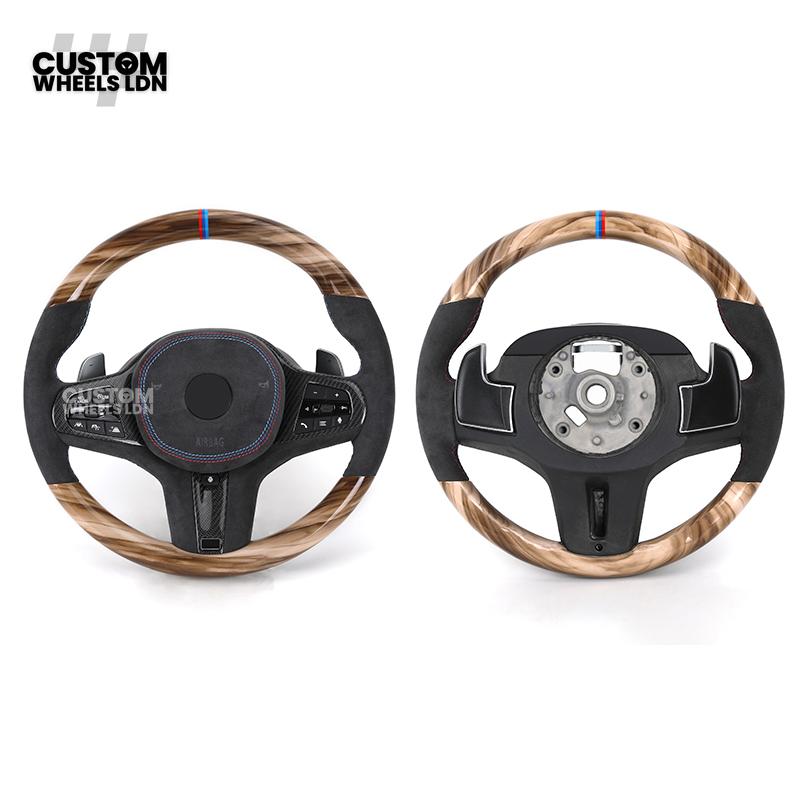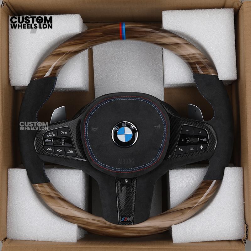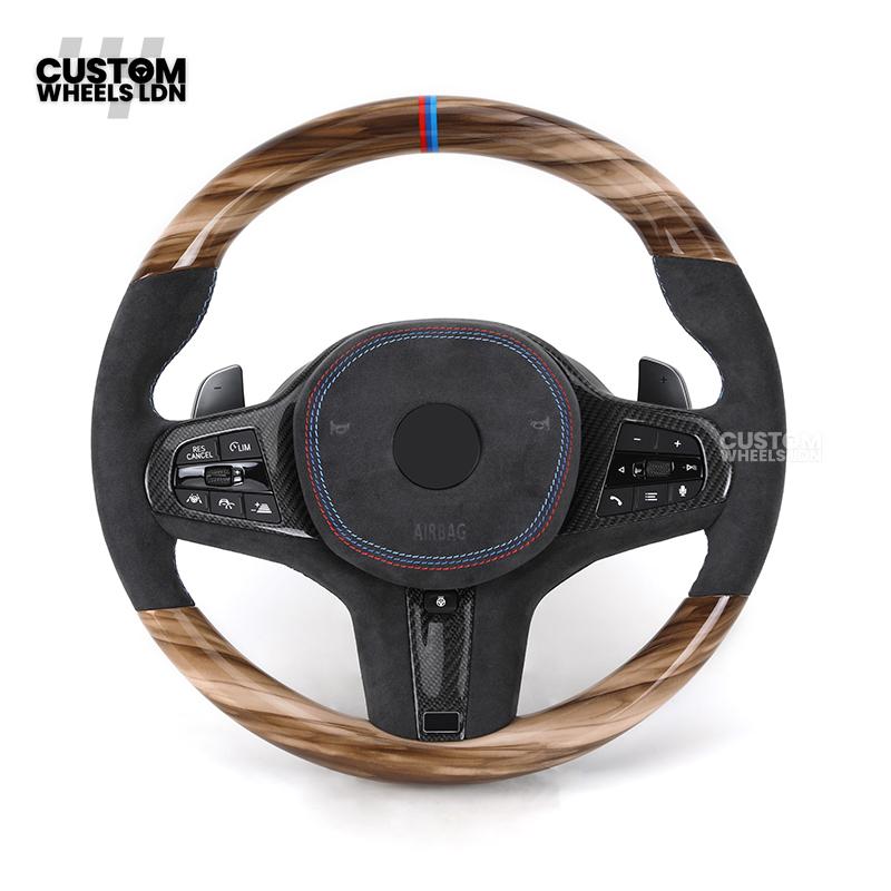 BMW Custom G-Series Steering Wheel – Gloss Wood Carbon, Flat Bottom, Alcantara Airbag – Fits G20 G21 G22 G30 G15 G05 G07 + more