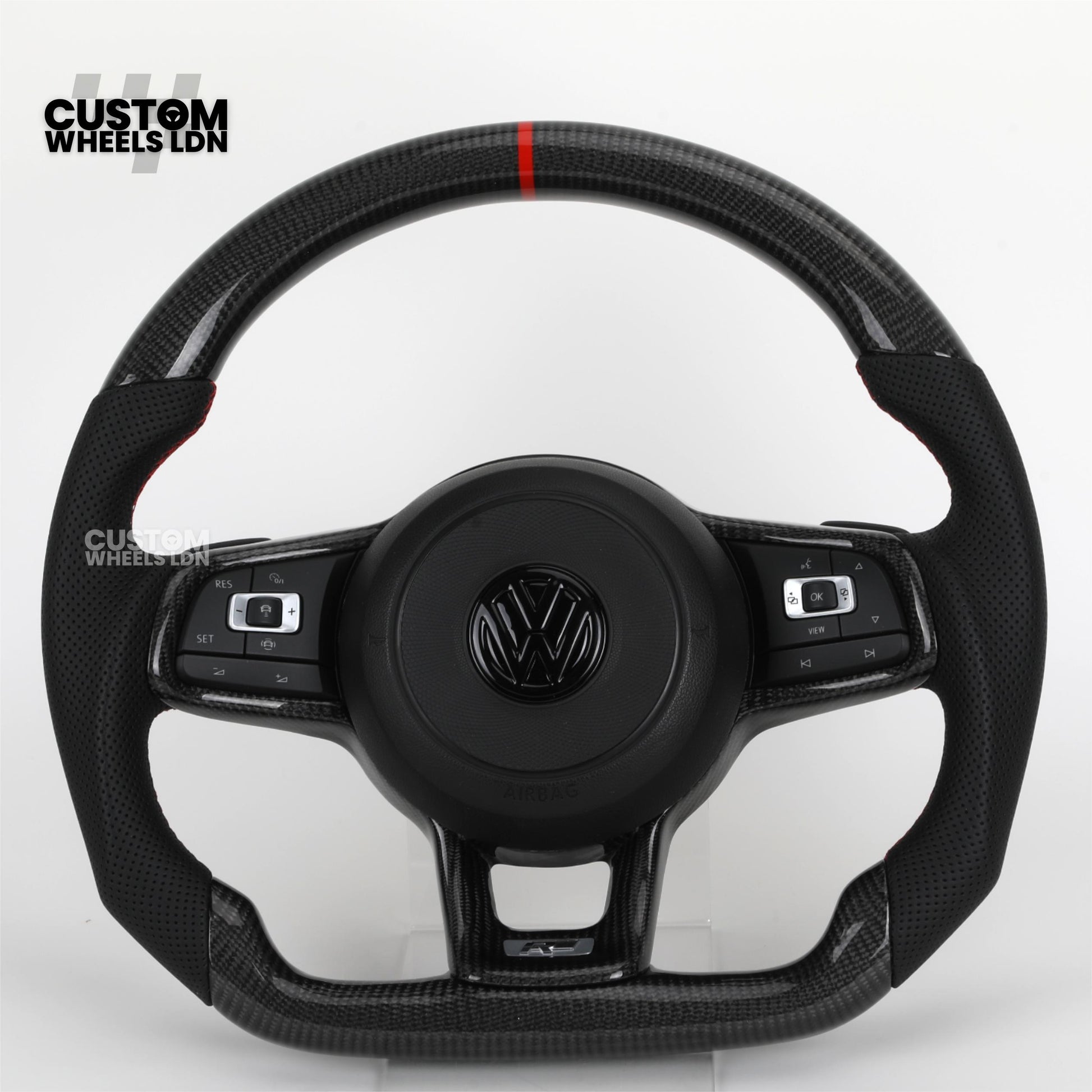 Volkswagen MK7 Custom Steering Wheel – Carbon Fibre with Red Centre Stripe, Perforated Leather Grips | Fits Golf GTI, R, Scirocco + more | Plug & Play